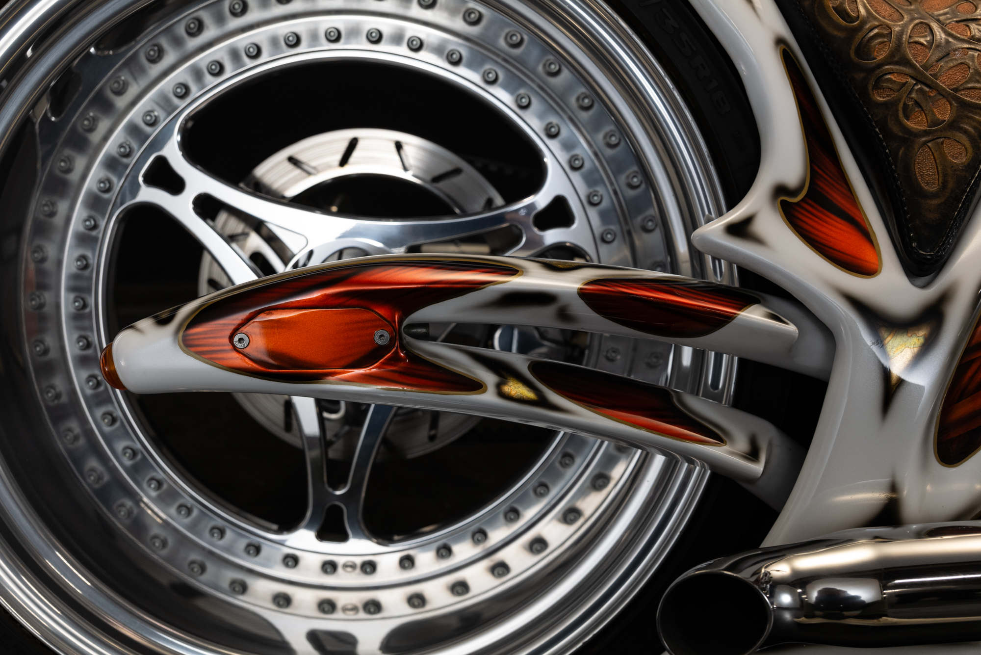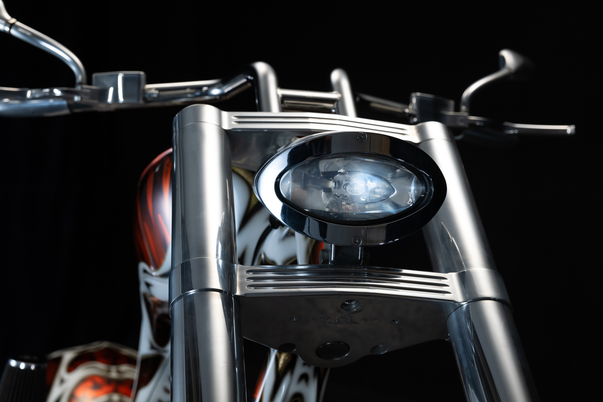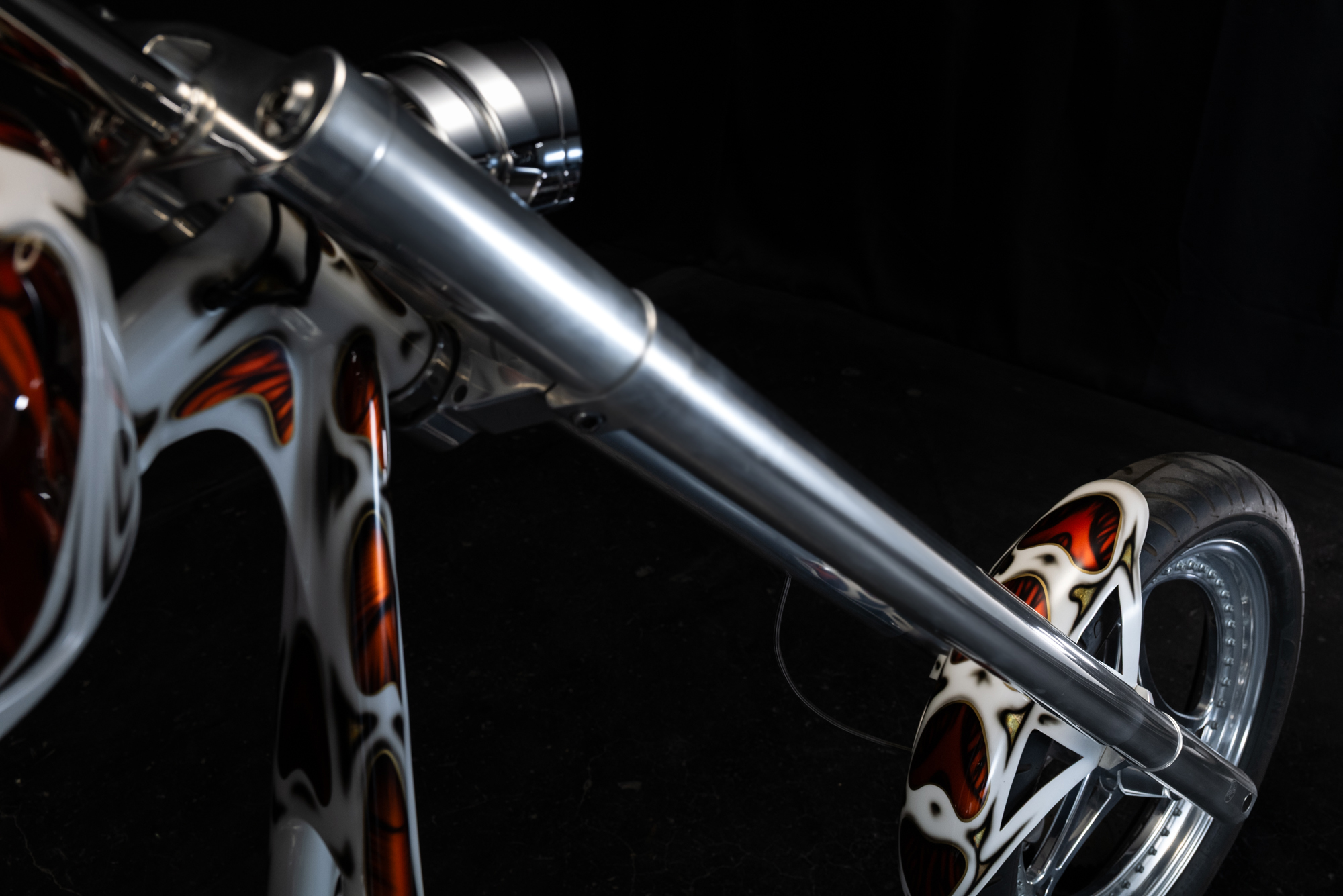 ご覧の通り、本車両は極端なロングフォークを有する印象的なシルエットを持っています。しかしトーマス・ハバーマンが設計したフレーム構造は、緻密に計算された完璧なディメンションを誇り、視覚的インパクトとは裏腹に、極めて自然に“普通に走る”ことのできる完成度を備えています。造形と構造、その両立こそが彼の真骨頂です。