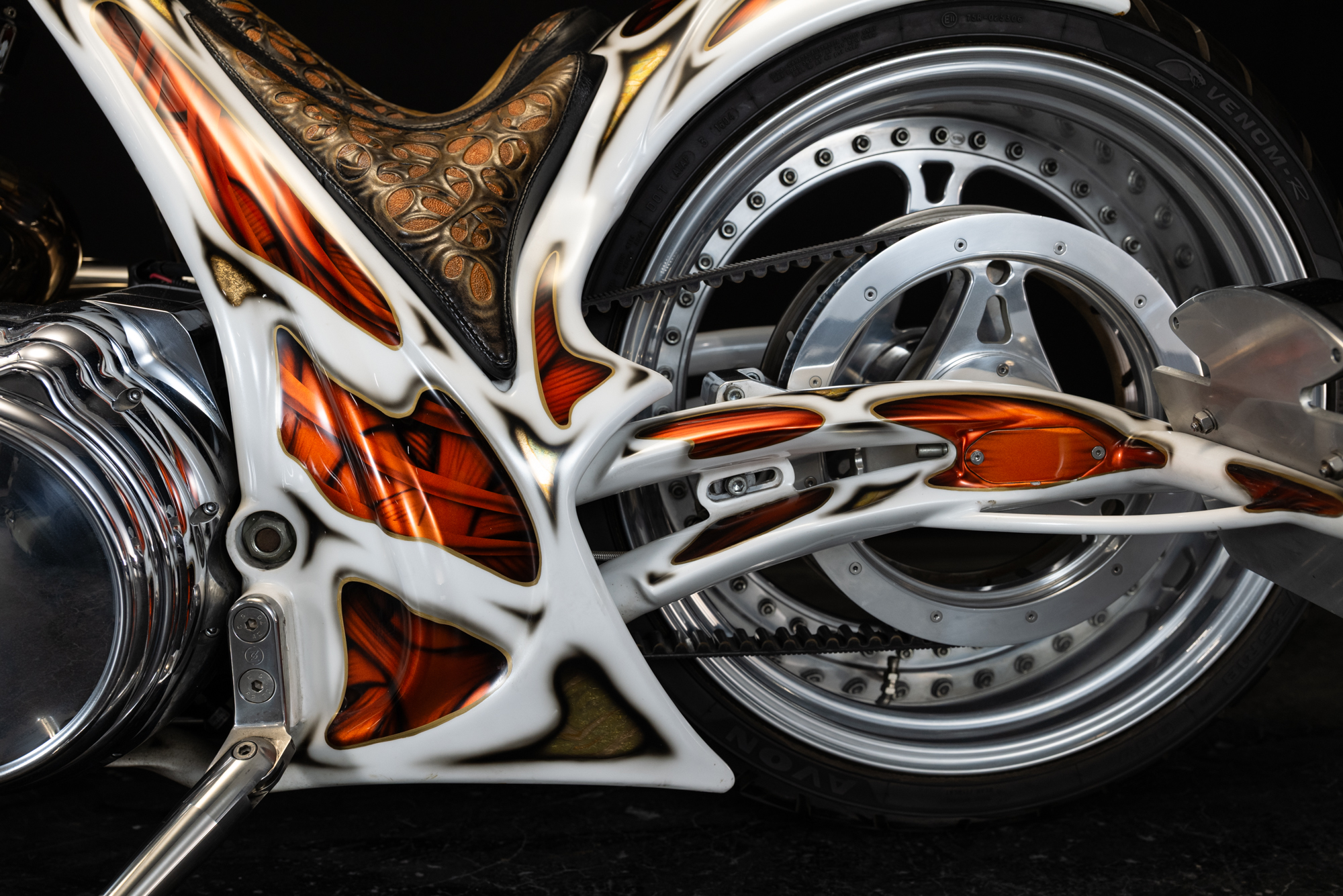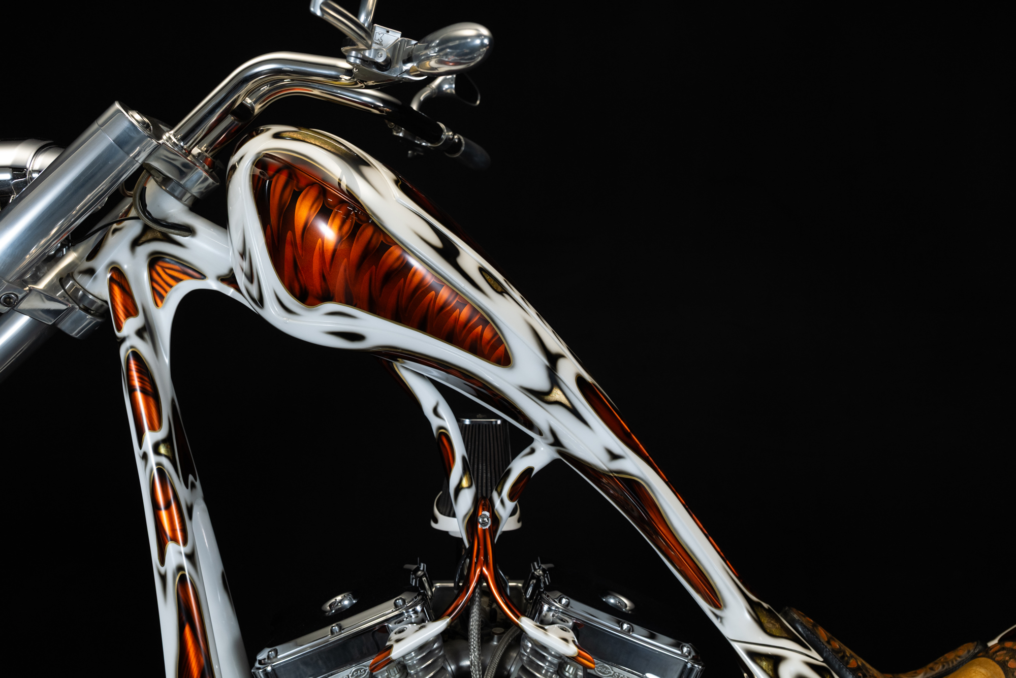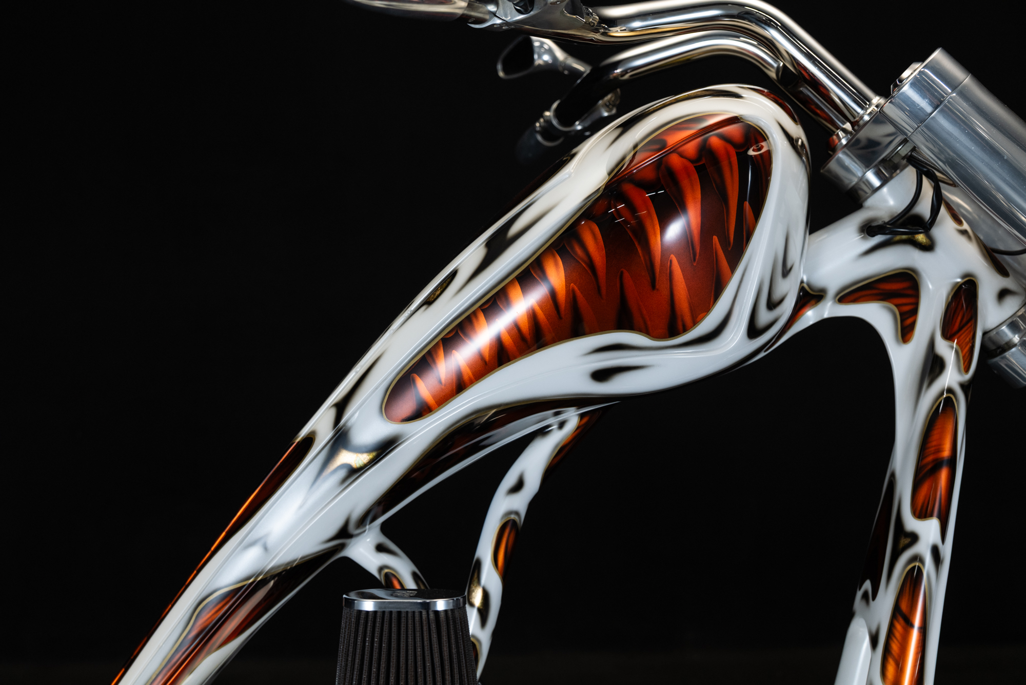ご覧の通り、本車両は極端なロングフォークを有する印象的なシルエットを持っています。しかしトーマス・ハバーマンが設計したフレーム構造は、緻密に計算された完璧なディメンションを誇り、視覚的インパクトとは裏腹に、極めて自然に“普通に走る”ことのできる完成度を備えています。造形と構造、その両立こそが彼の真骨頂です。