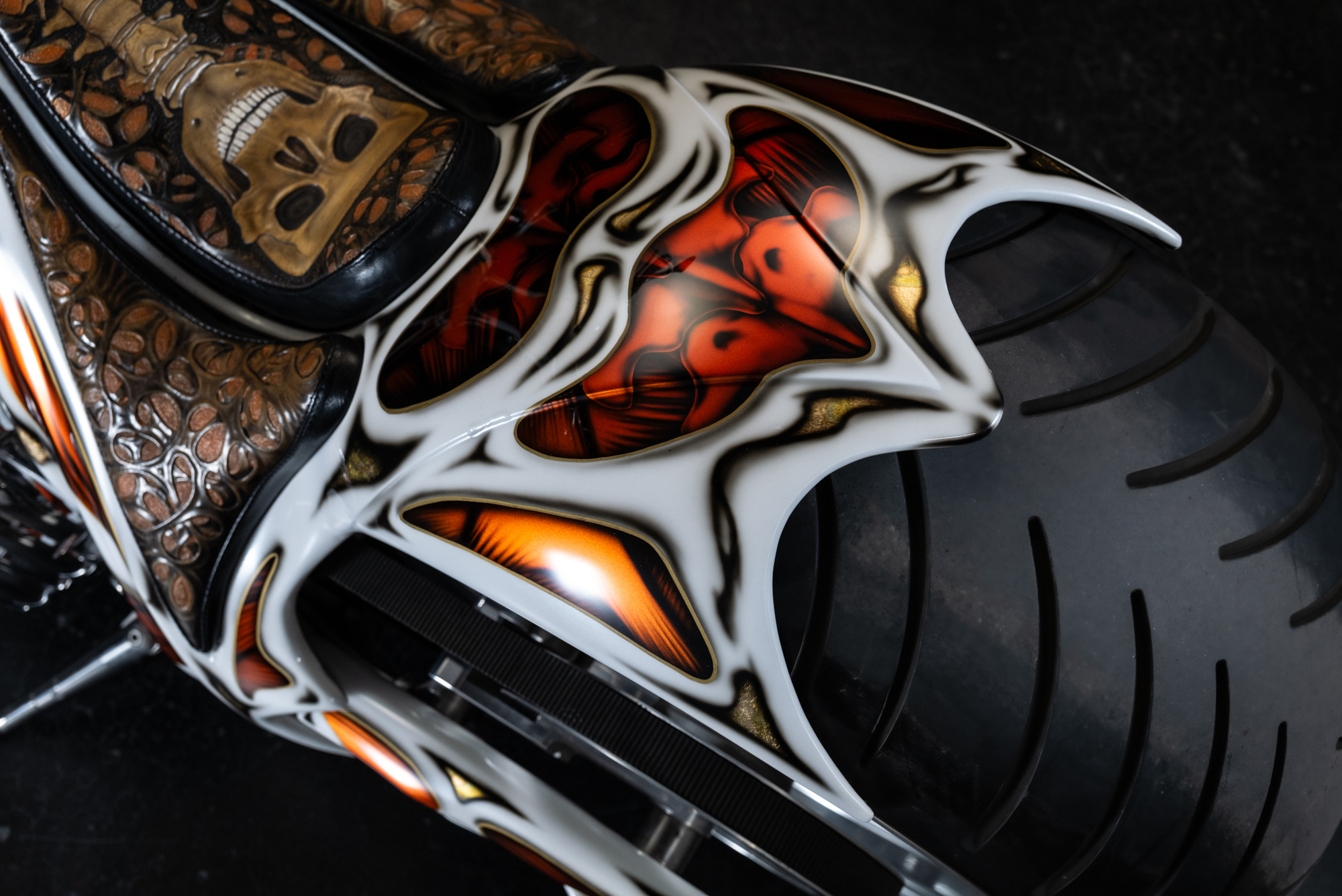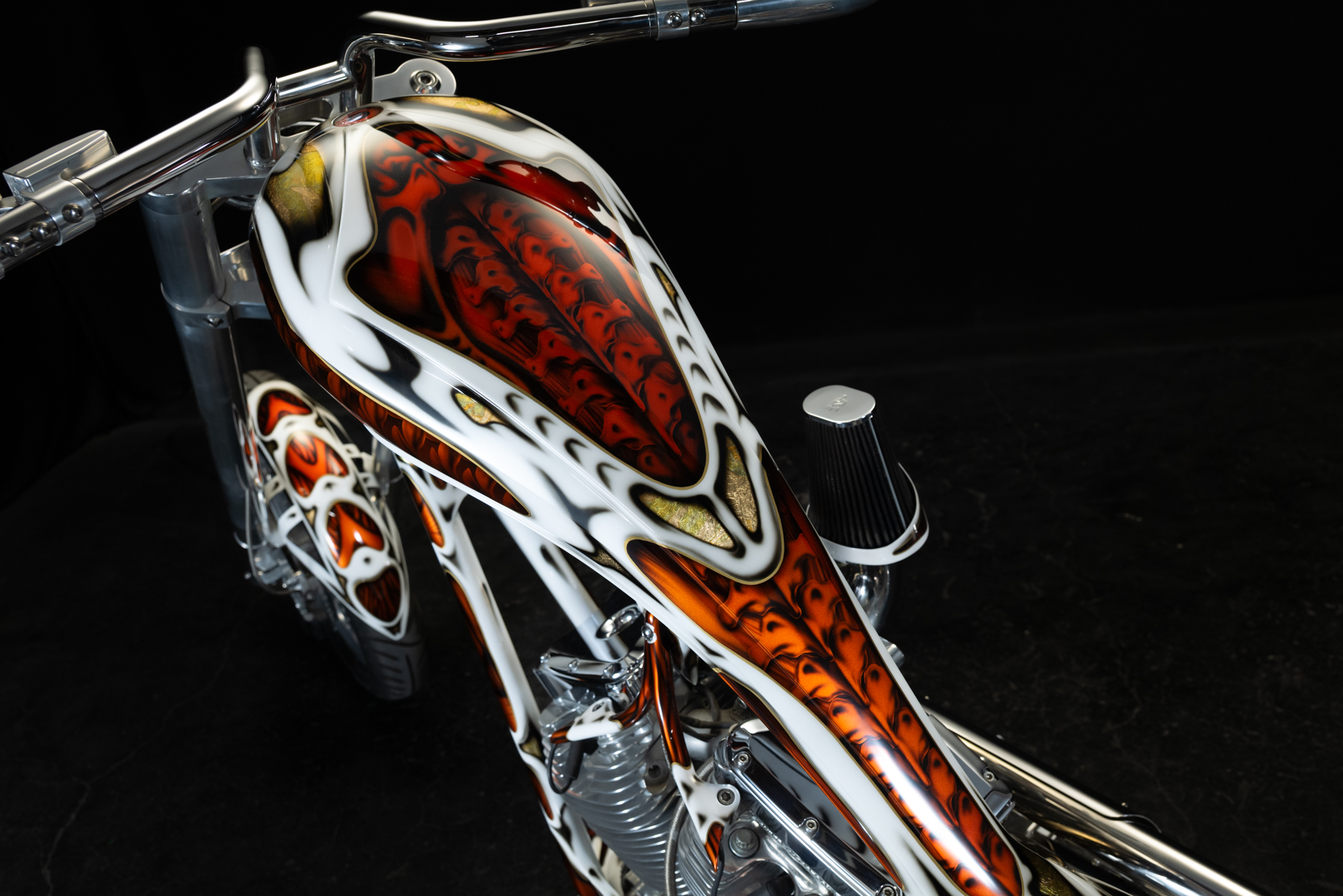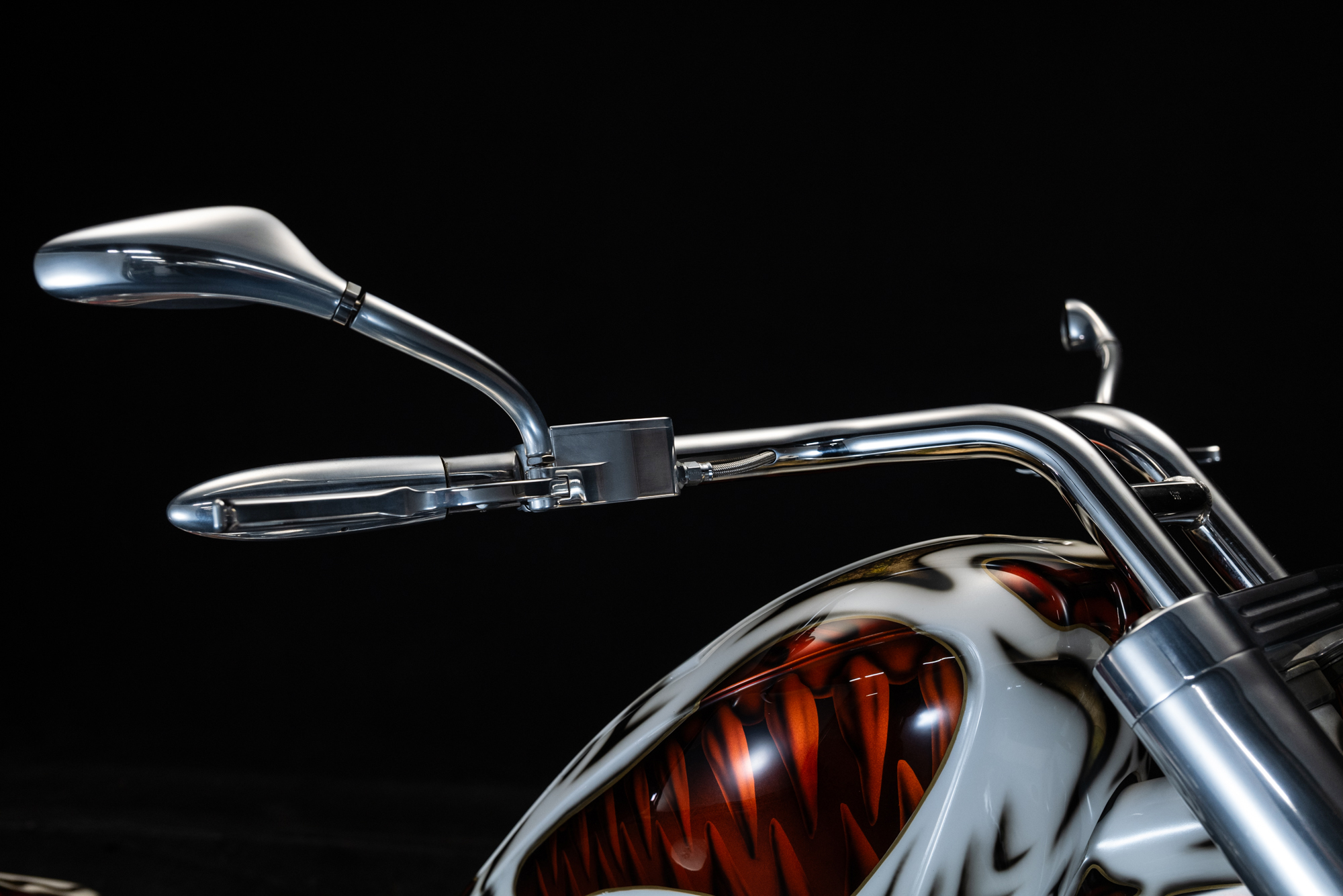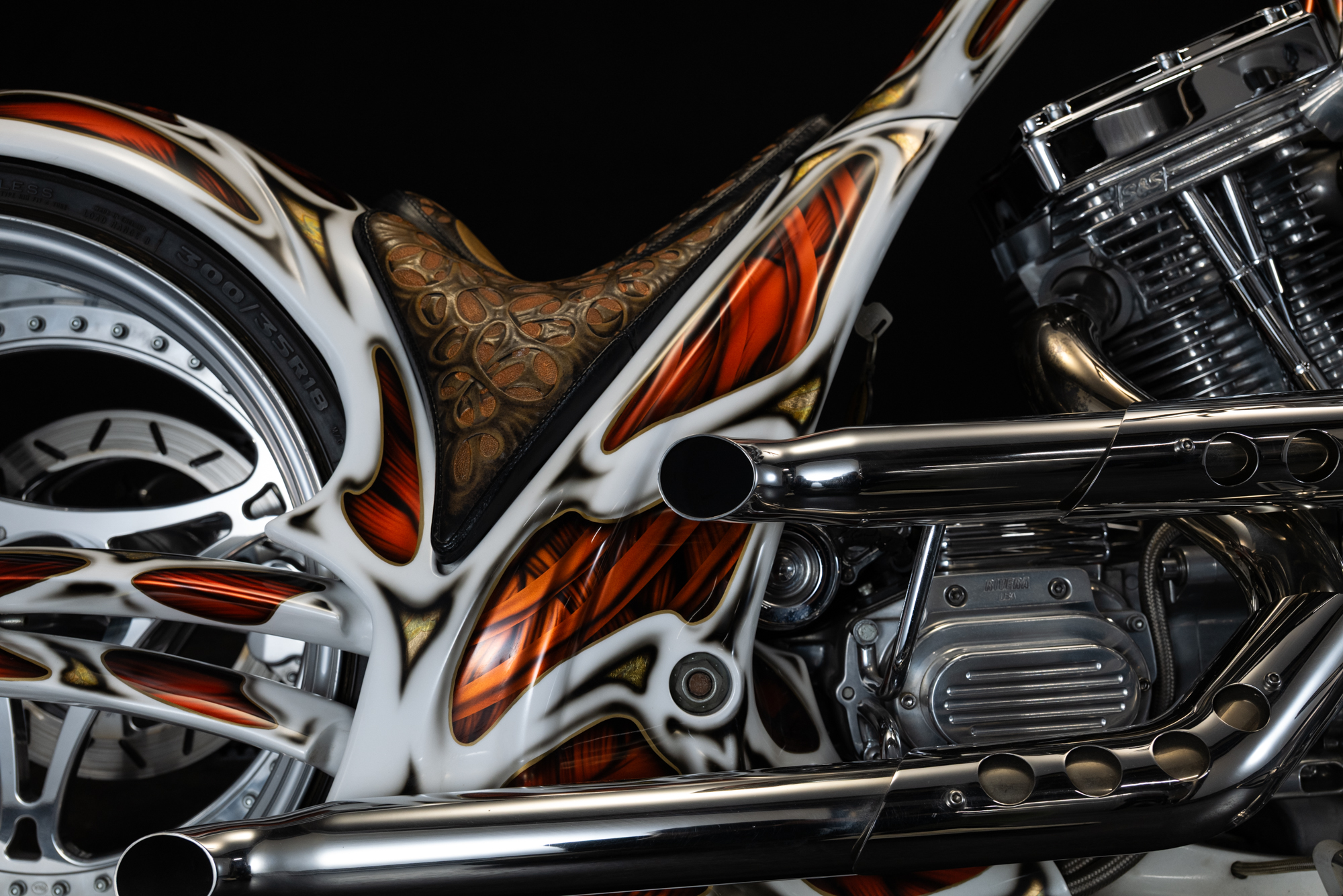 本車両はその初訪問時に正式発注した特別な一台です。フレーム / スイングアーム / ガソリンタンク / 前後フェンダー / オイルタンクに至るまで、車体の主要構造はすべてトーマス・ハバーマン本人による製作。ホイールやマフラー、ハンドルの選定、最終組み付け、そしてアートグラフィックのプロデュースはBAD LANDが担いました。