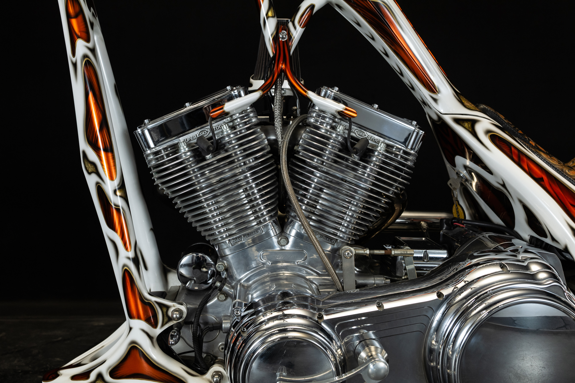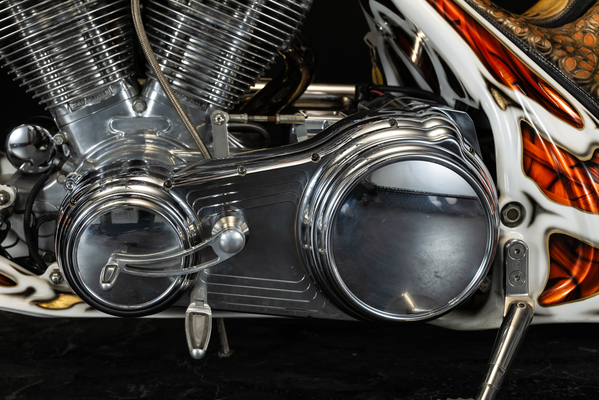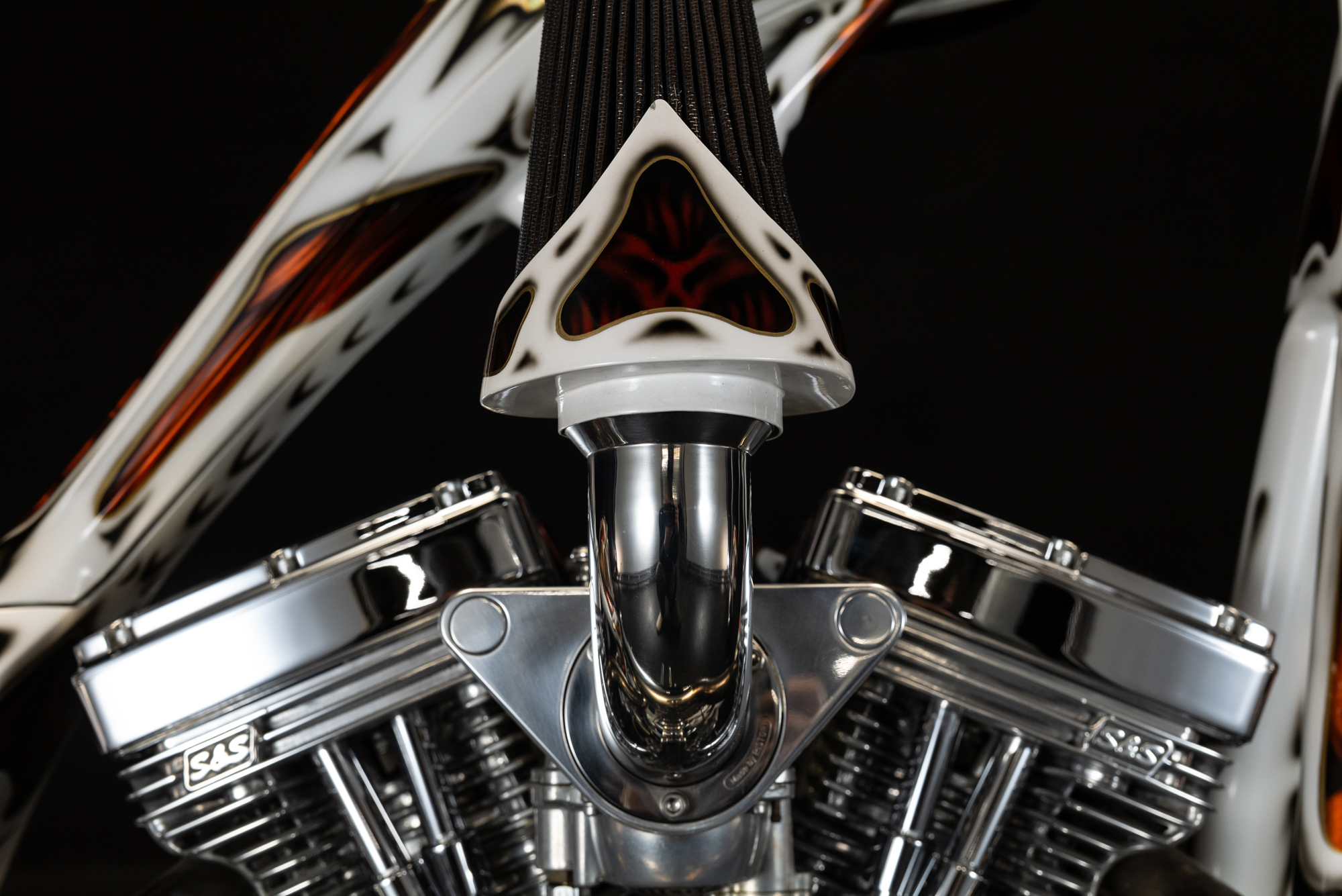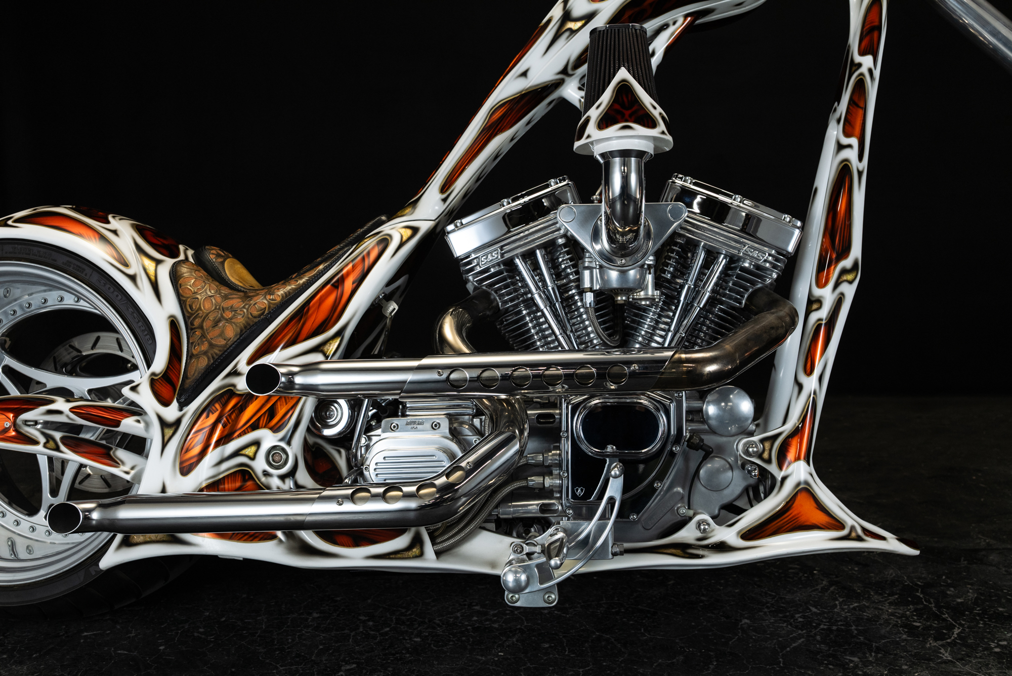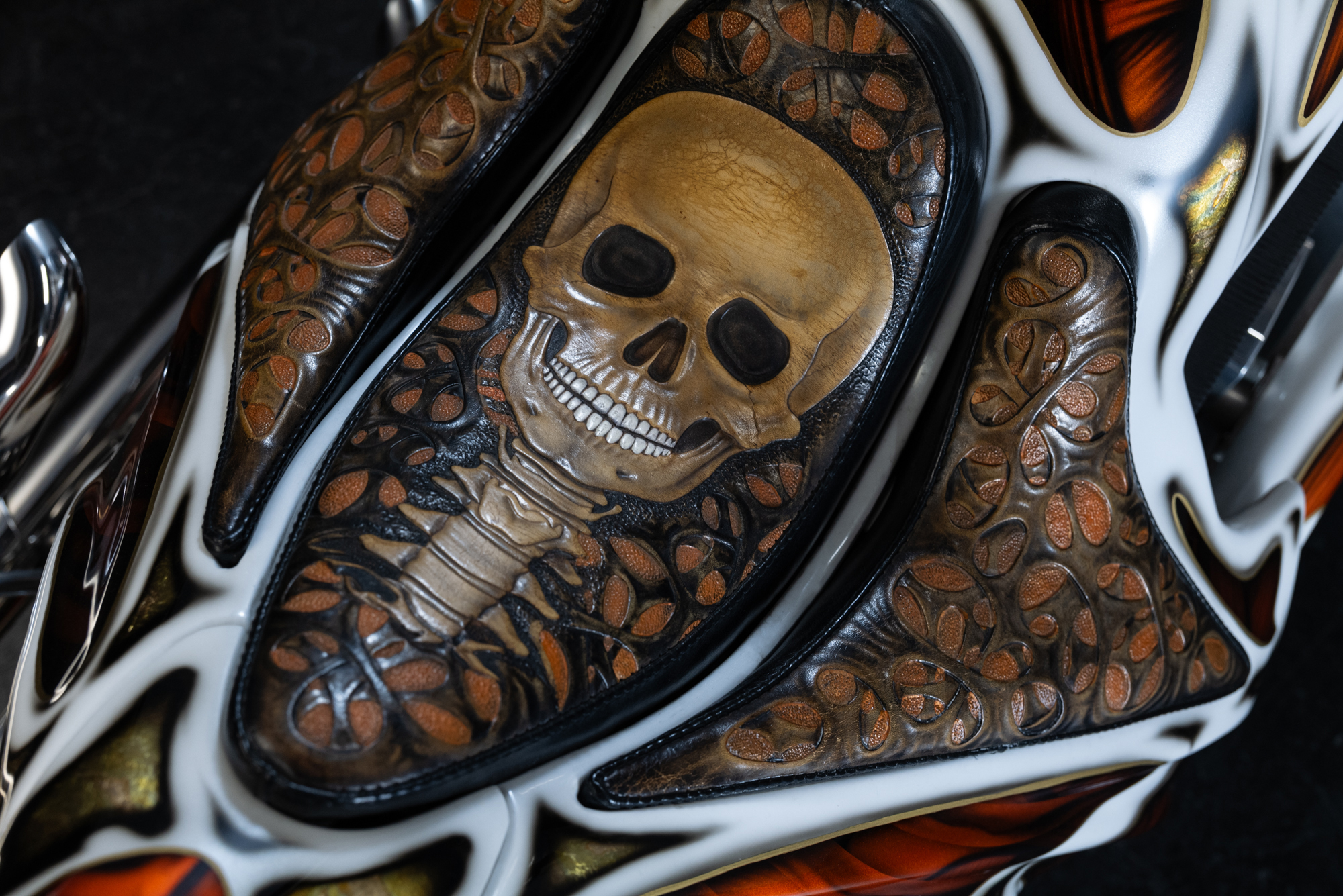 本車両はその初訪問時に正式発注した特別な一台です。フレーム / スイングアーム / ガソリンタンク / 前後フェンダー / オイルタンクに至るまで、車体の主要構造はすべてトーマス・ハバーマン本人による製作。ホイールやマフラー、ハンドルの選定、最終組み付け、そしてアートグラフィックのプロデュースはBAD LANDが担いました。