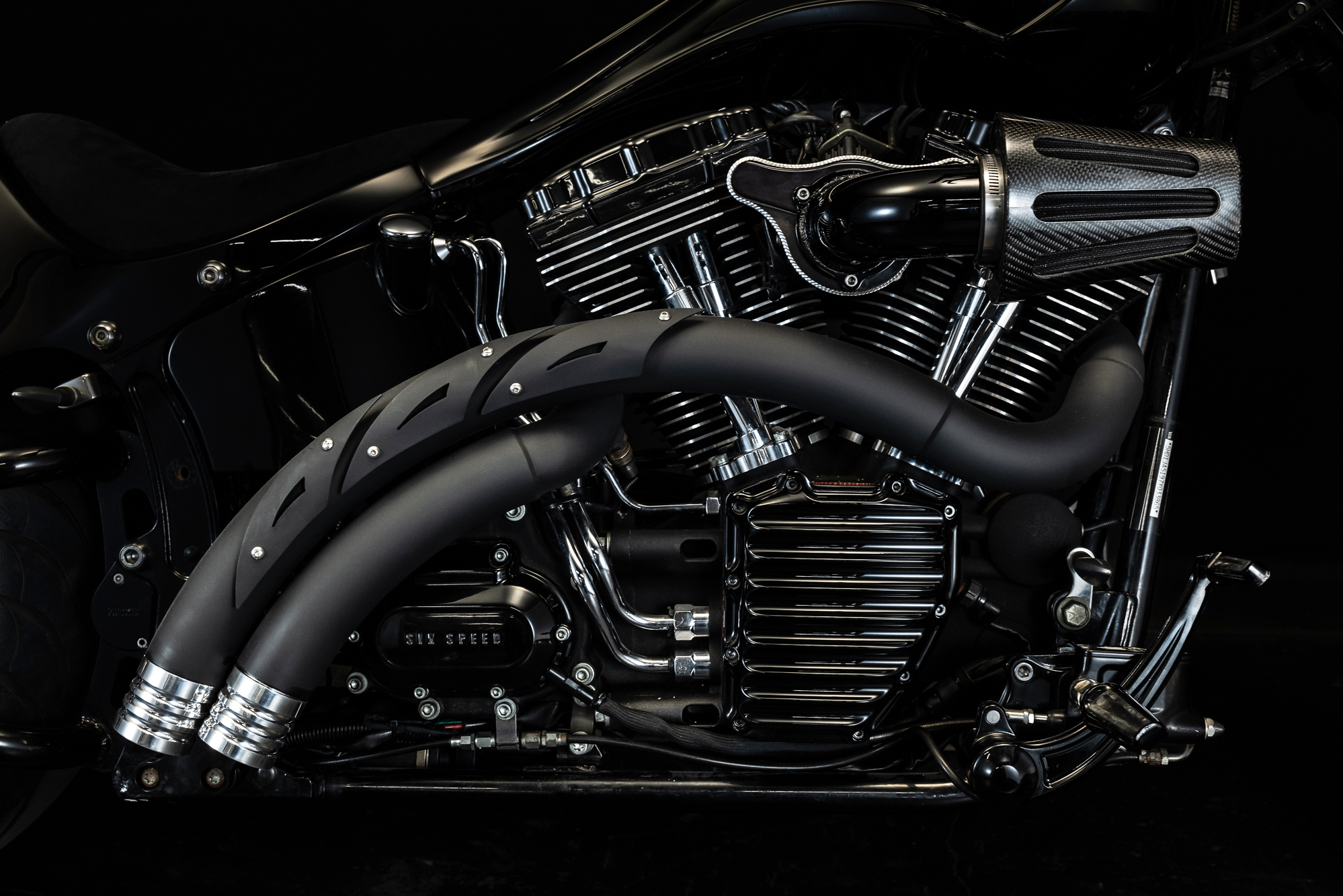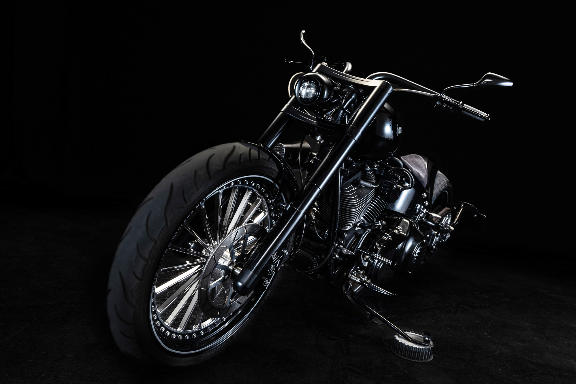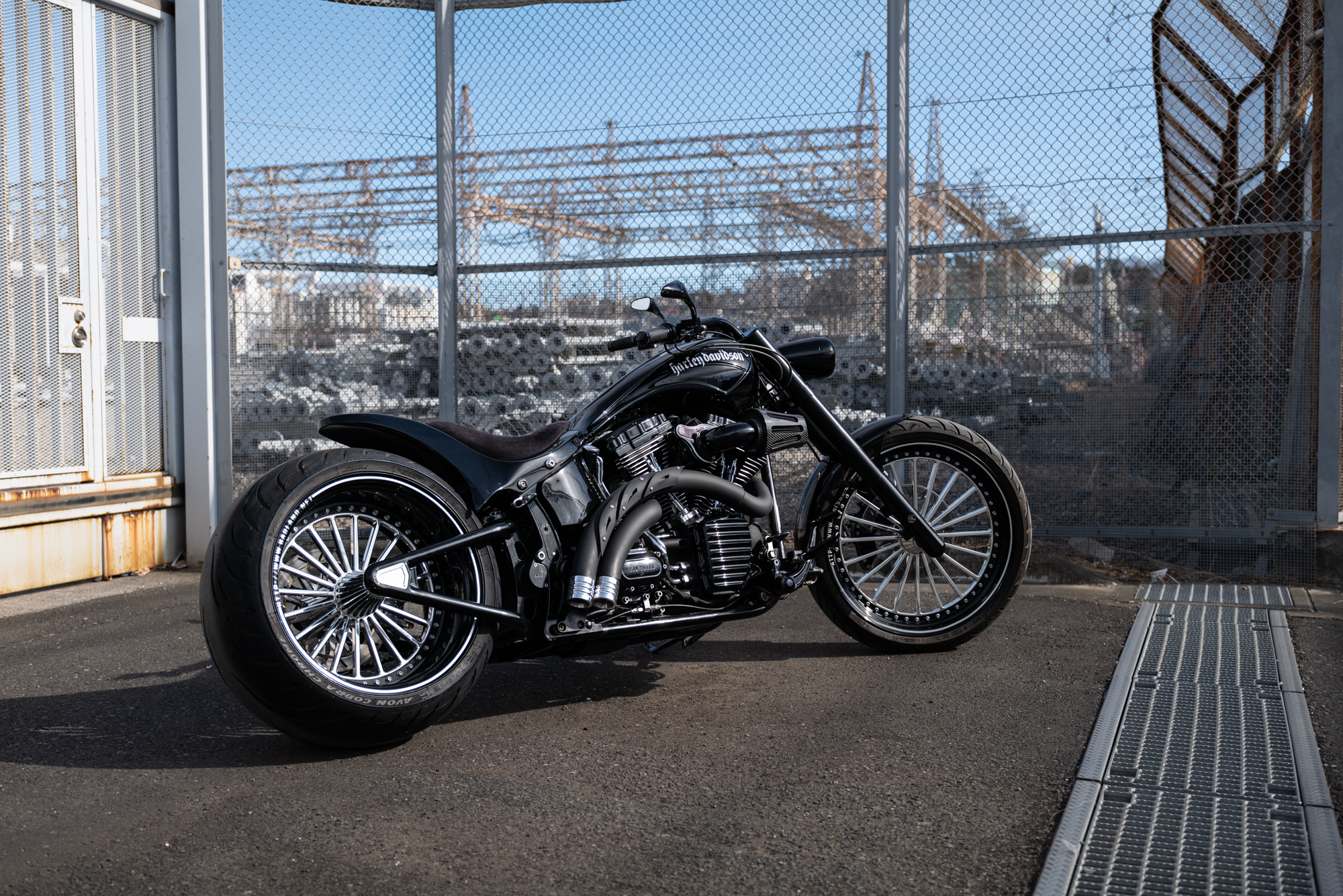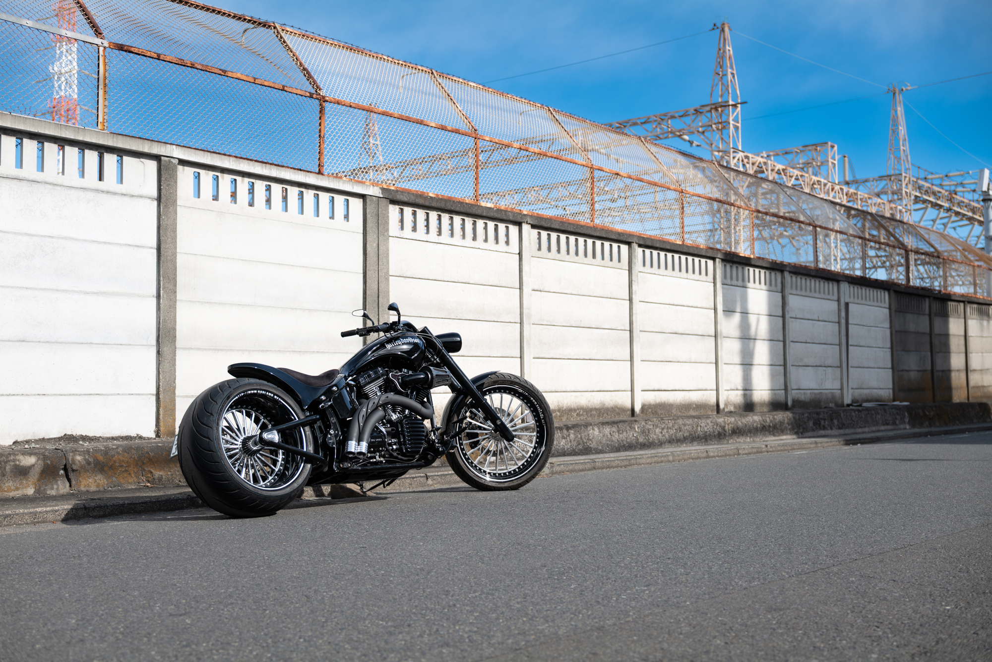 2007年式TwinCam FXSTB (ナイトトレイン / インジェクション仕様) をベースに弊社にて製作。優美な曲線を多用しBAD LAND流ユーロスタイル・カスタムの王道と呼ぶに相応しい仕上がりにて結実。前後ホィールはドイツの名門 : RICK’S MOTORCYCLES社製。また同様にRICK’S MOTORCYCLESにて開発された、300ワイドのタイヤを装着しても、車体全体のセンターバランスを保持する事可能な3次ドライブ方式によりワイドスィングアームをセットアップ。フロントフォークにはオランダの名門 : SJP社のプロダクトを採用等々、完全ワンメイクによるボディーパーツからなる車両全体のデザインとハイエンド・プロダクツが高次元で融合したまさに至極のハイエンド・カスタムです。現車は弊社ファクトリーにて展示中。是非実車をご覧下さい。