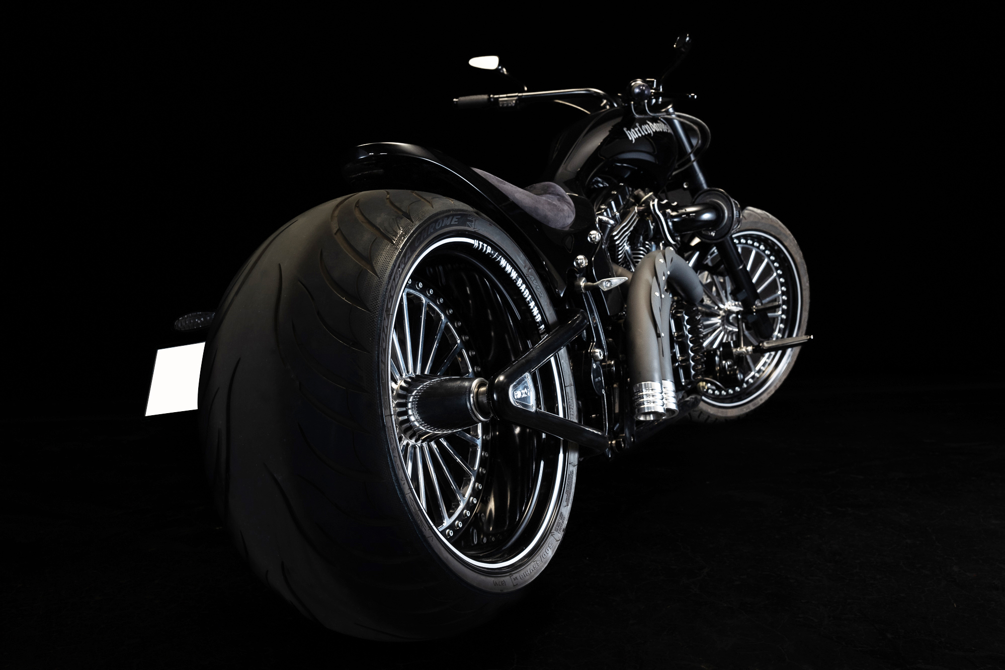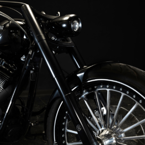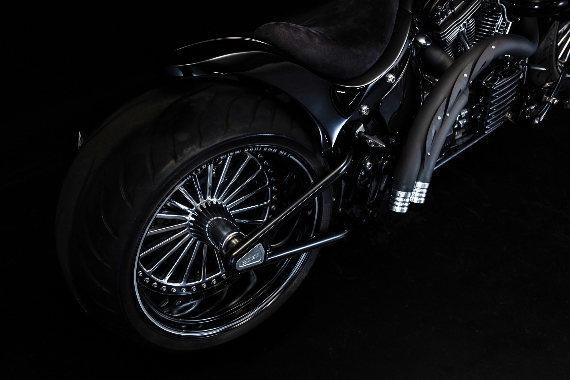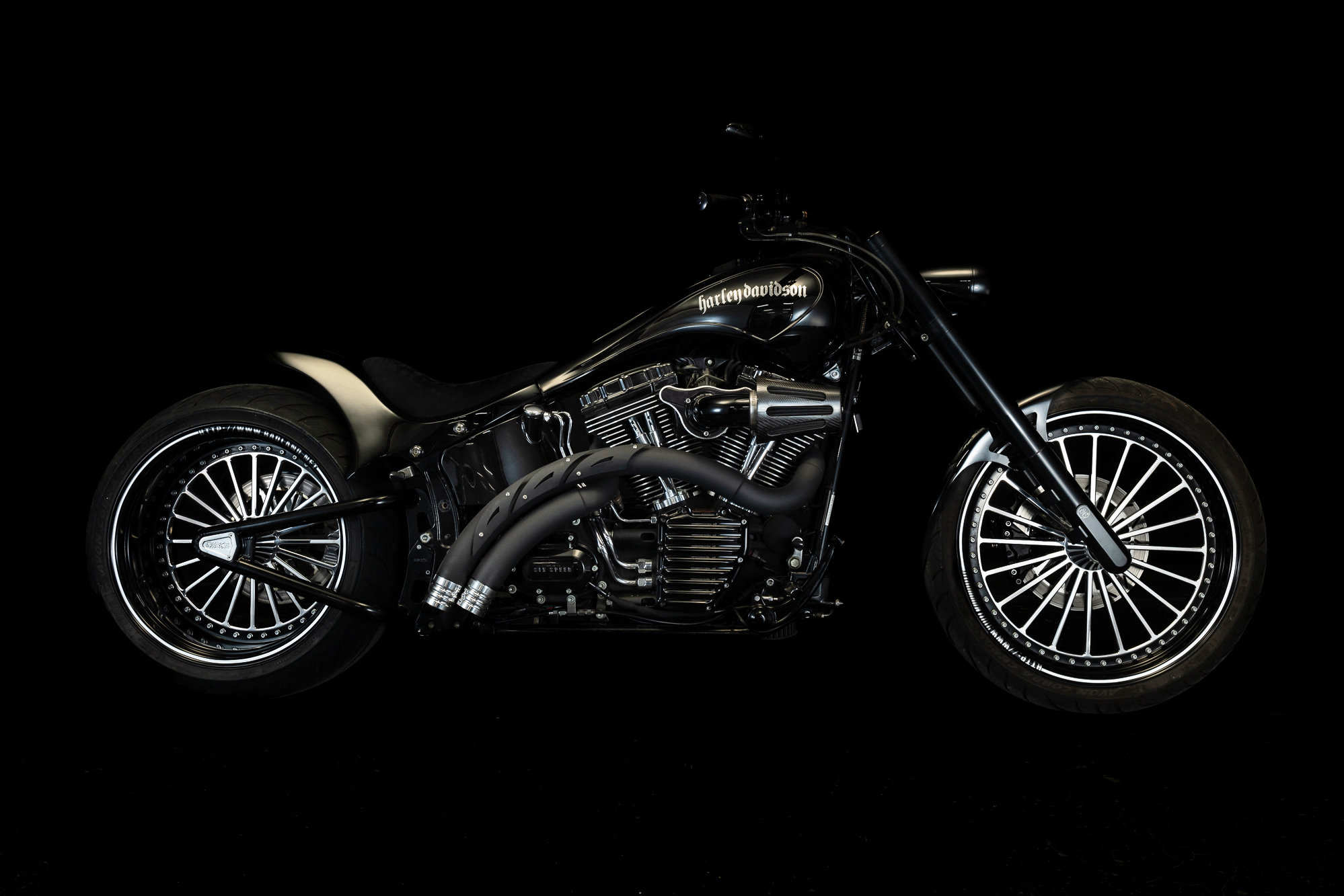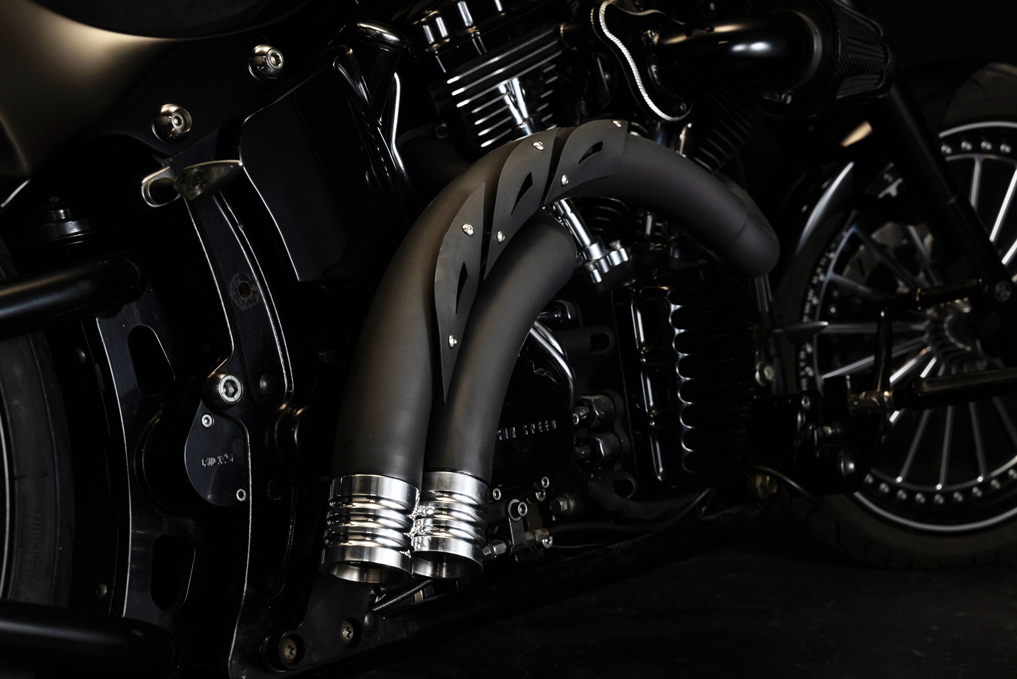 2007年式TwinCam FXSTB (ナイトトレイン / インジェクション仕様) をベースに弊社にて製作。優美な曲線を多用しBAD LAND流ユーロスタイル・カスタムの王道と呼ぶに相応しい仕上がりにて結実。前後ホィールはドイツの名門 : RICK’S MOTORCYCLES社製。また同様にRICK’S MOTORCYCLESにて開発された、300ワイドのタイヤを装着しても、車体全体のセンターバランスを保持する事可能な3次ドライブ方式によりワイドスィングアームをセットアップ。フロントフォークにはオランダの名門 : SJP社のプロダクトを採用等々、完全ワンメイクによるボディーパーツからなる車両全体のデザインとハイエンド・プロダクツが高次元で融合したまさに至極のハイエンド・カスタムです。現車は弊社ファクトリーにて展示中。是非実車をご覧下さい。