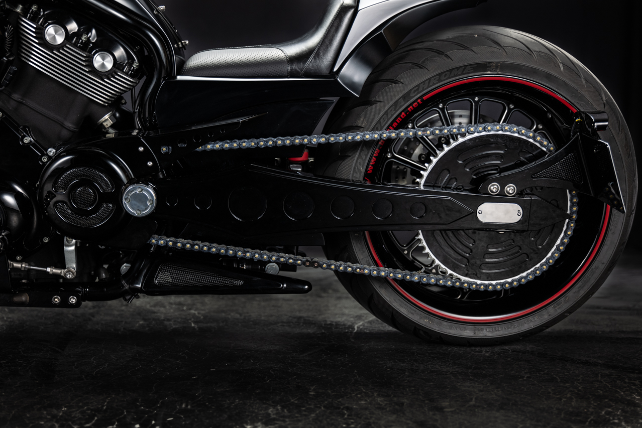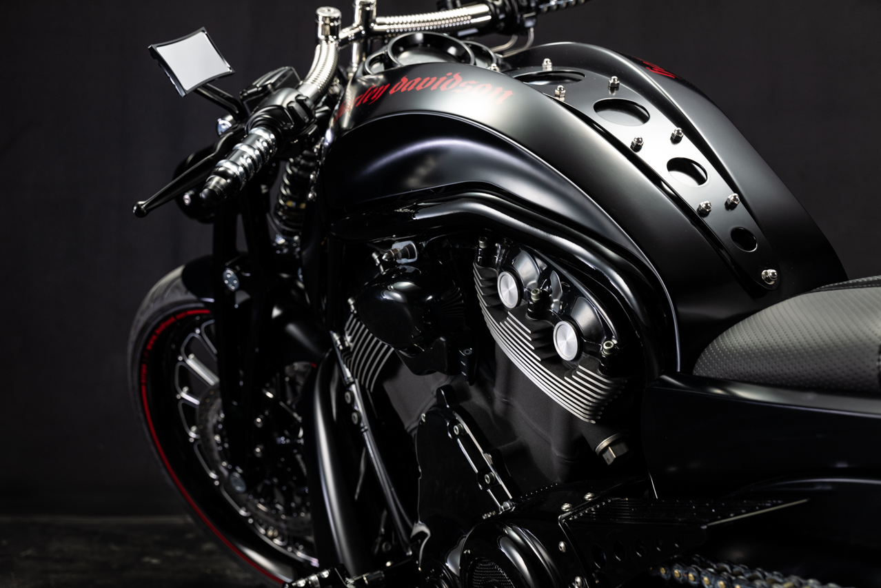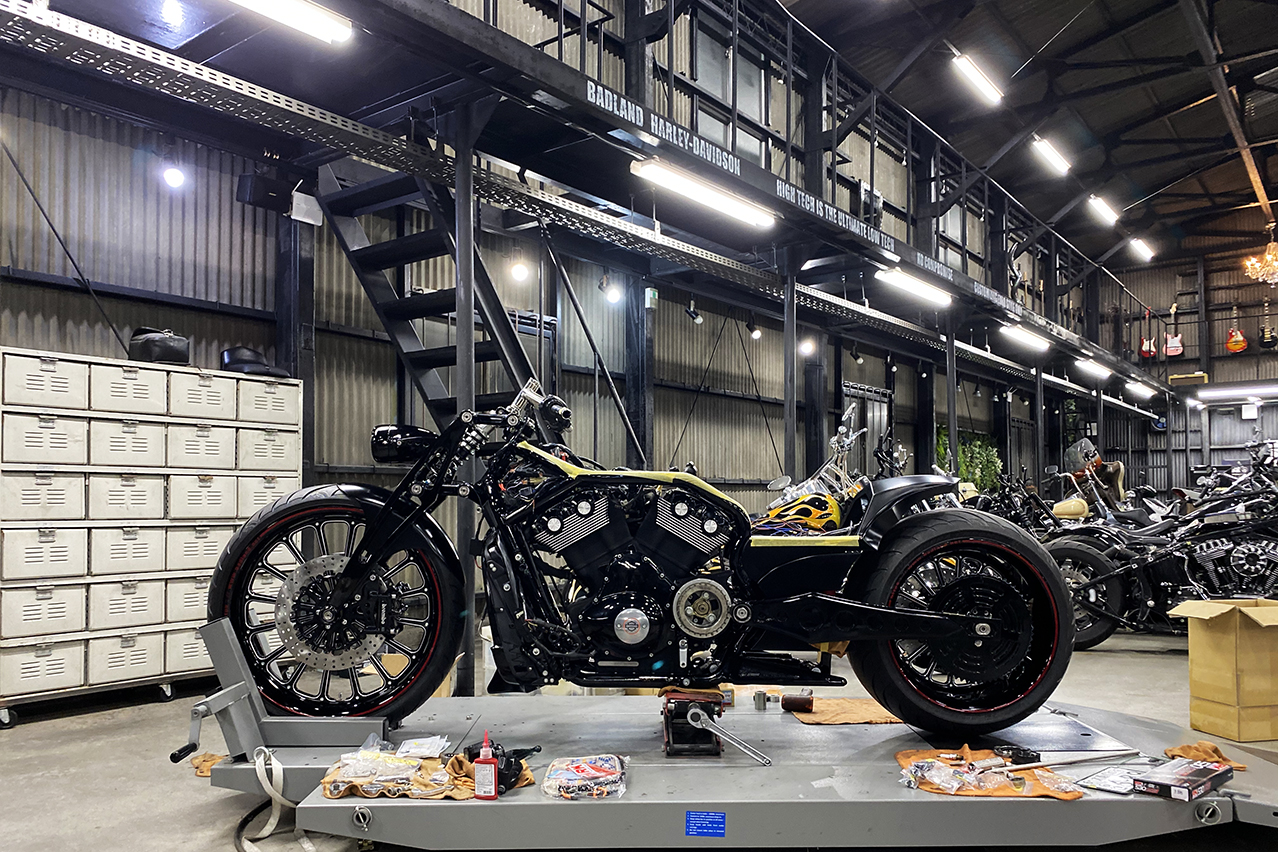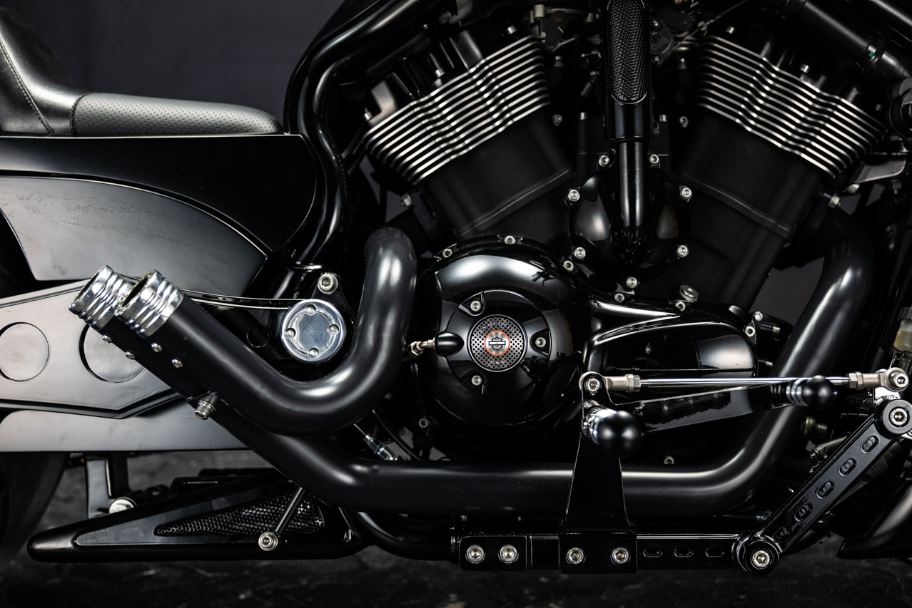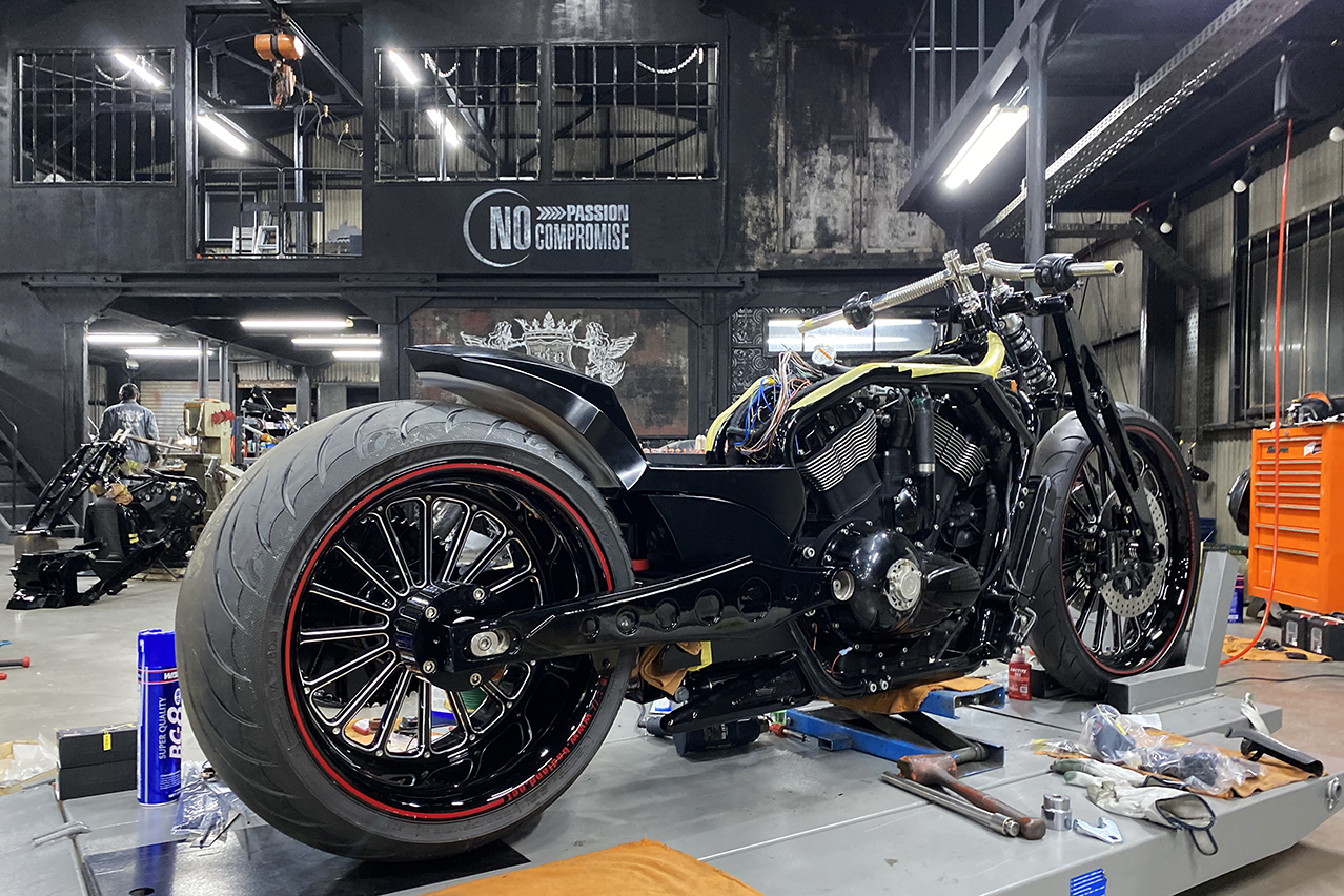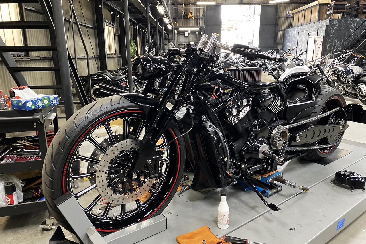 弊社製作のV-RODカスタムにおいて、現状その頂点を極める仕様の車両です。アメリカ : Renegade Custom Motorcycle Wheels社に製作を依頼しております、弊社オリジナルデザインによる1ピース・アルミビレット製ホィールを装着。フロントホィールのサイズは大口径23インチとなります。またスィングアームを純正の長さより50mm延長をしており文字通りのロー&ロングのスタイリングを実現。因みに歴代ハーレーの各モデルの中でV-RODに使用されている純正リアベルトが一番長い設定となっている為、必然的に同車のリア駆動はチェーン仕様に変更を致しております。またリア駆動をチェーンに変更する為、トランスミッションスプロケット及びリアチェーンスプロケットはV-RODの純正歯数より算出しオリジナルにて製作をしたスプロケットを使用しております。その他オリジナルのワンメイク・ガーターフォークの装着、純正フレームへの大幅なモディファイ、ガソリンタンクのワンメイク、またハンドルも然り等々、ご覧の通りの一切妥協の無い完璧な仕上がりのV-RODカスタムとなっております。走行距離も極めて少なく、また常時室内保管の車両ですので外観の美観も損なわれておりません。現車は只今弊社ファクトリーにてご覧頂けます。