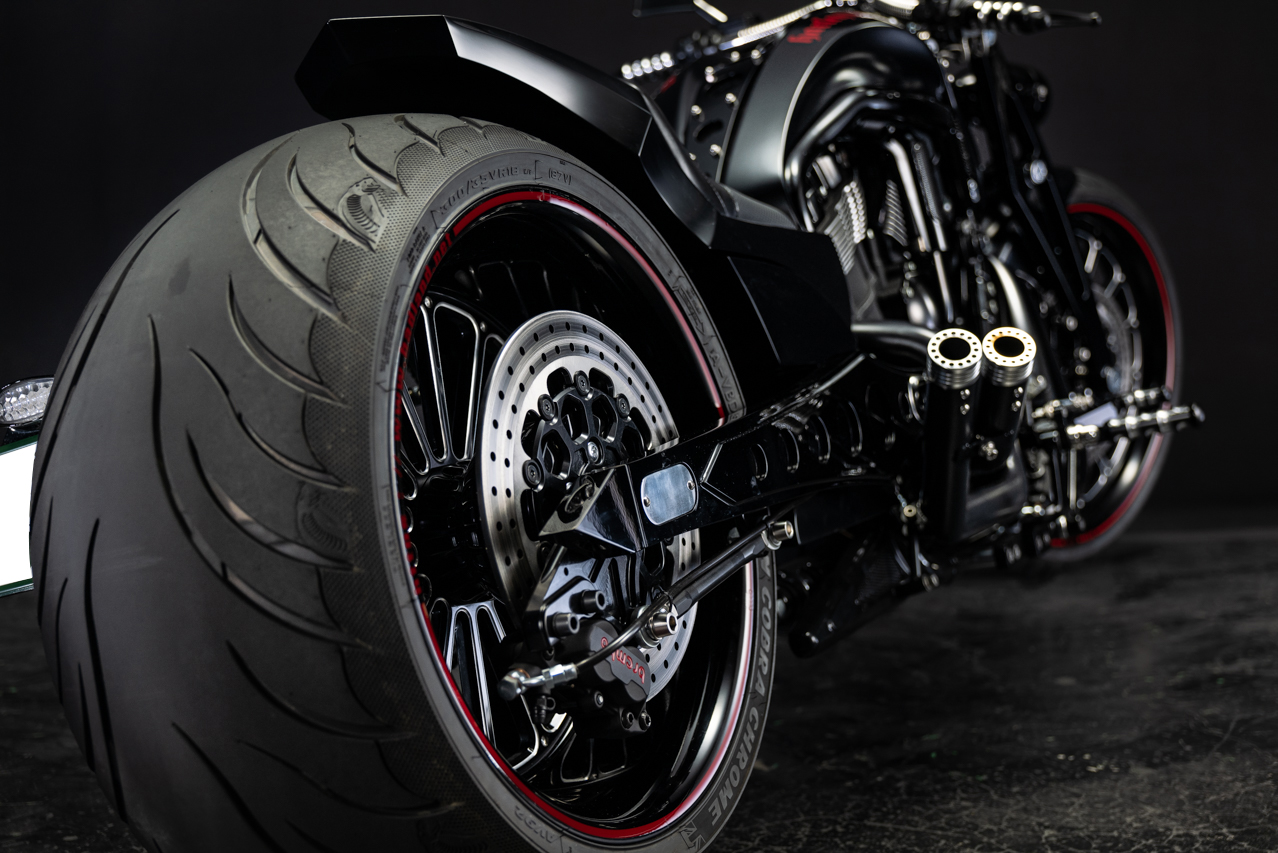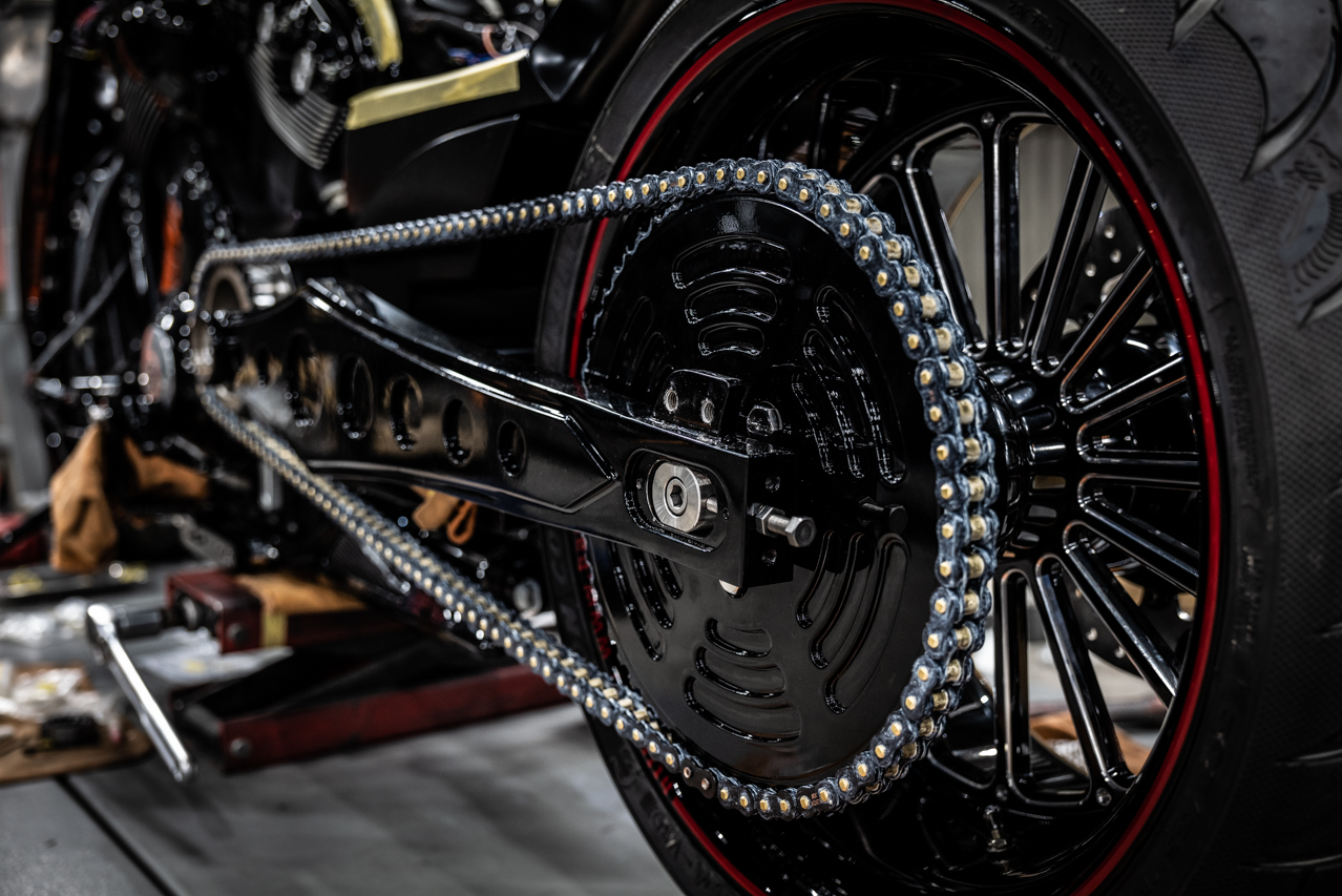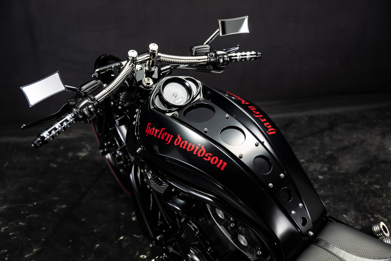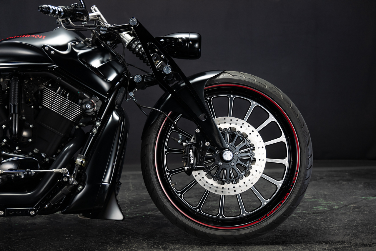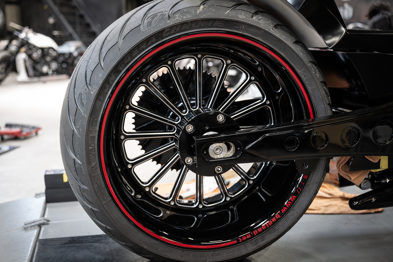 弊社製作のV-RODカスタムにおいて、現状その頂点を極める仕様の車両です。アメリカ : Renegade Custom Motorcycle Wheels社に製作を依頼しております、弊社オリジナルデザインによる1ピース・アルミビレット製ホィールを装着。フロントホィールのサイズは大口径23インチとなります。またスィングアームを純正の長さより50mm延長をしており文字通りのロー&ロングのスタイリングを実現。因みに歴代ハーレーの各モデルの中でV-RODに使用されている純正リアベルトが一番長い設定となっている為、必然的に同車のリア駆動はチェーン仕様に変更を致しております。またリア駆動をチェーンに変更する為、トランスミッションスプロケット及びリアチェーンスプロケットはV-RODの純正歯数より算出しオリジナルにて製作をしたスプロケットを使用しております。その他オリジナルのワンメイク・ガーターフォークの装着、純正フレームへの大幅なモディファイ、ガソリンタンクのワンメイク、またハンドルも然り等々、ご覧の通りの一切妥協の無い完璧な仕上がりのV-RODカスタムとなっております。走行距離も極めて少なく、また常時室内保管の車両ですので外観の美観も損なわれておりません。現車は只今弊社ファクトリーにてご覧頂けます。