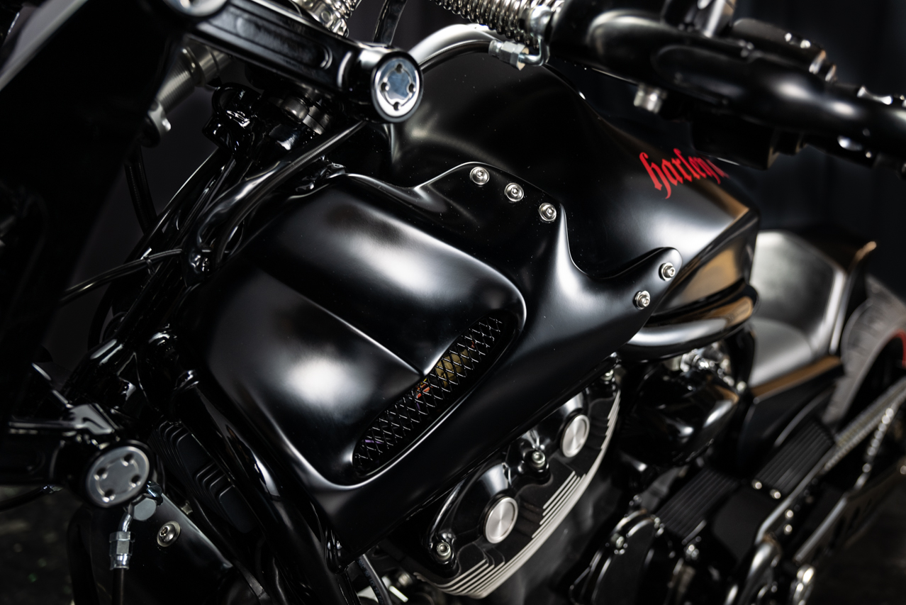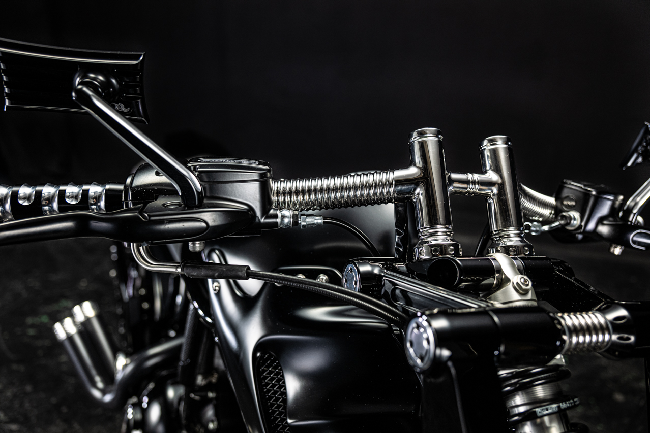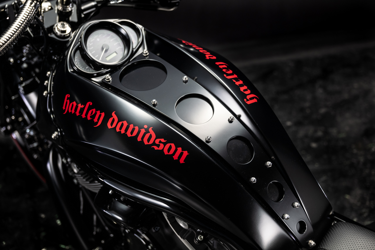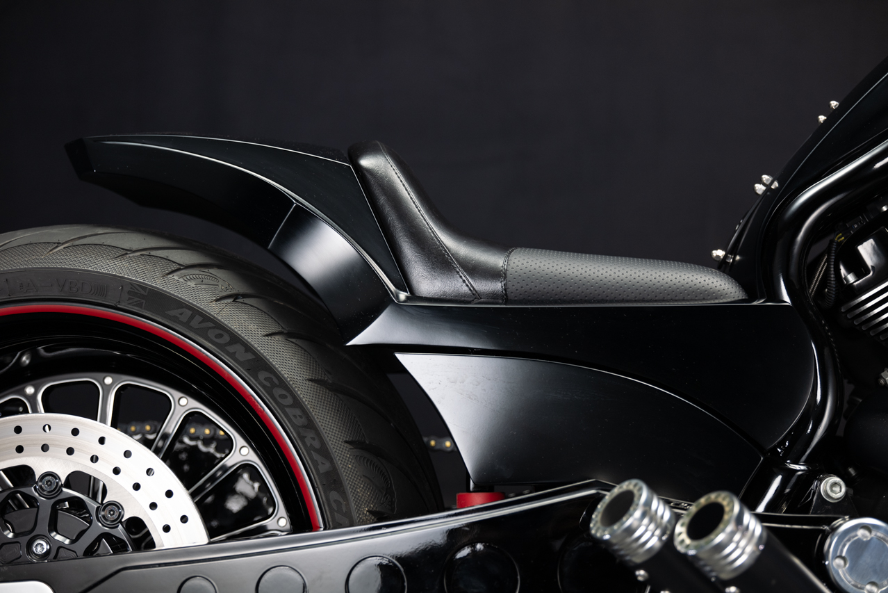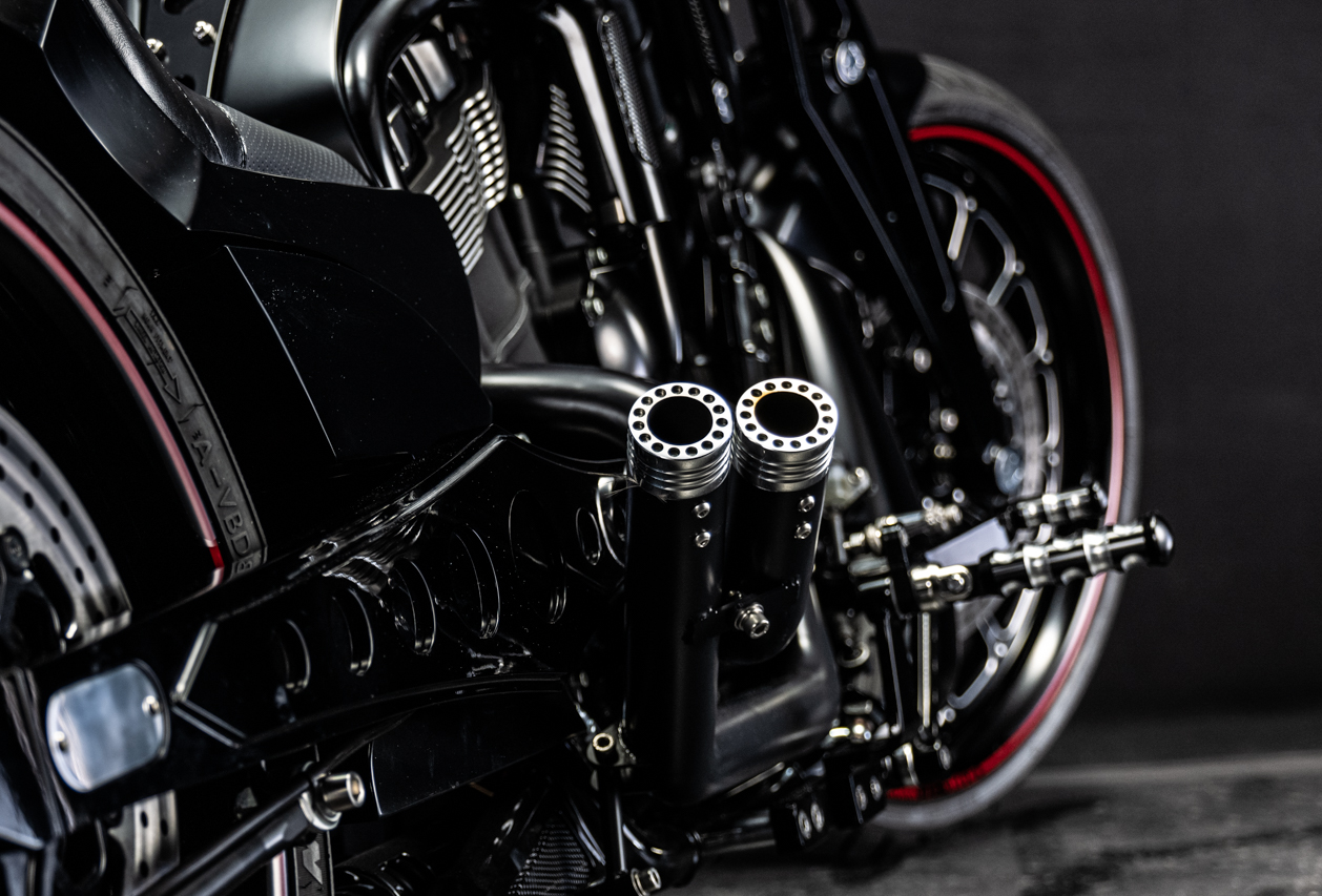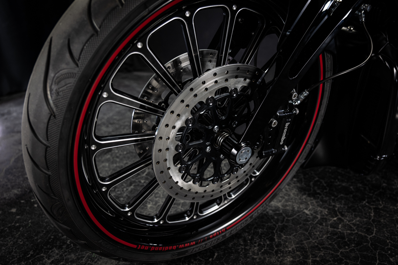 弊社製作のV-RODカスタムにおいて、現状その頂点を極める仕様の車両です。アメリカ : Renegade Custom Motorcycle Wheels社に製作を依頼しております、弊社オリジナルデザインによる1ピース・アルミビレット製ホィールを装着。フロントホィールのサイズは大口径23インチとなります。またスィングアームを純正の長さより50mm延長をしており文字通りのロー&ロングのスタイリングを実現。因みに歴代ハーレーの各モデルの中でV-RODに使用されている純正リアベルトが一番長い設定となっている為、必然的に同車のリア駆動はチェーン仕様に変更を致しております。またリア駆動をチェーンに変更する為、トランスミッションスプロケット及びリアチェーンスプロケットはV-RODの純正歯数より算出しオリジナルにて製作をしたスプロケットを使用しております。その他オリジナルのワンメイク・ガーターフォークの装着、純正フレームへの大幅なモディファイ、ガソリンタンクのワンメイク、またハンドルも然り等々、ご覧の通りの一切妥協の無い完璧な仕上がりのV-RODカスタムとなっております。走行距離も極めて少なく、また常時室内保管の車両ですので外観の美観も損なわれておりません。現車は只今弊社ファクトリーにてご覧頂けます。