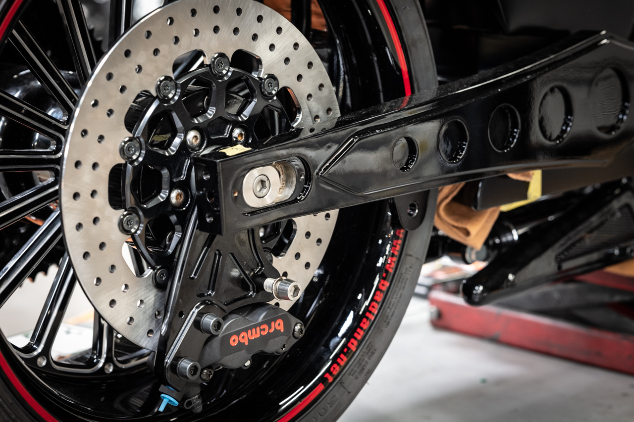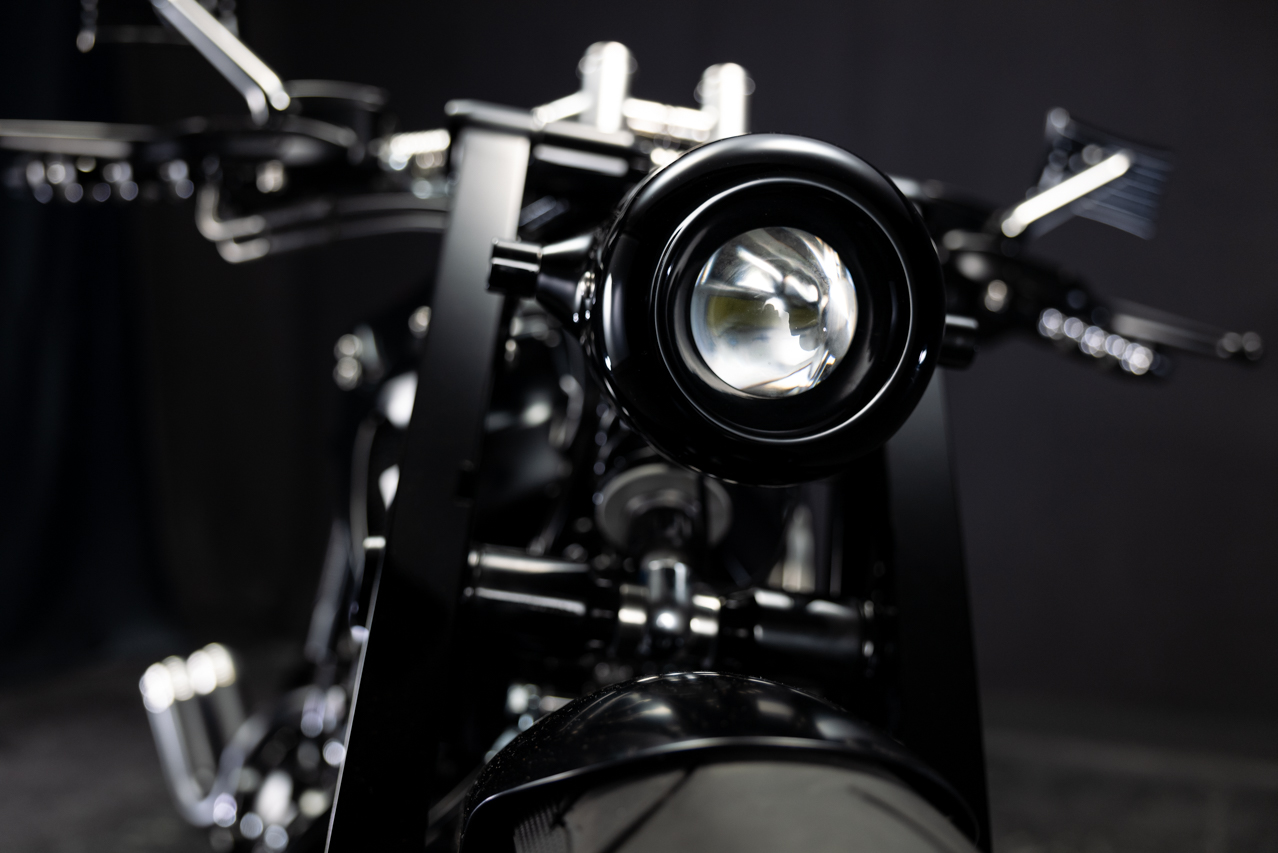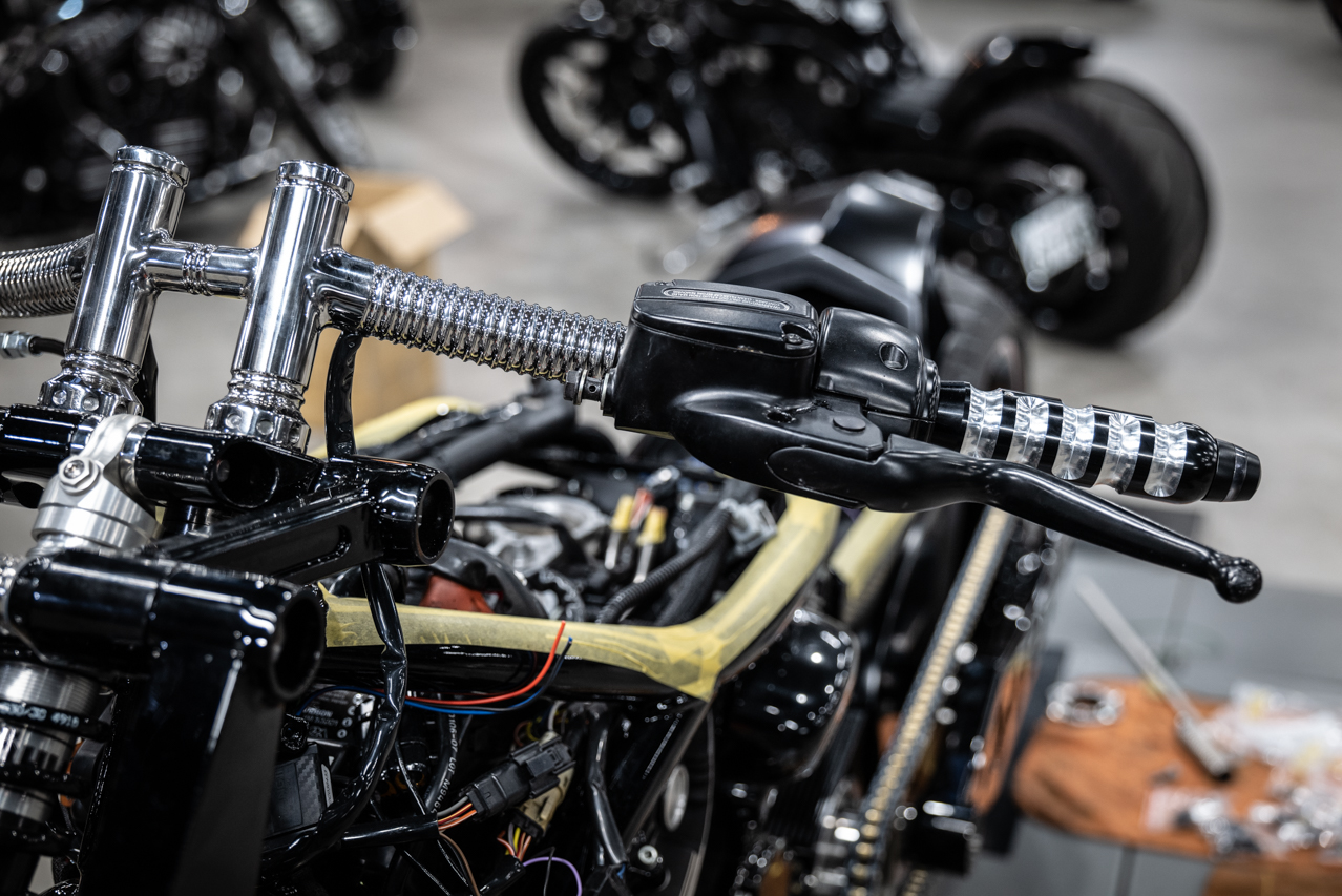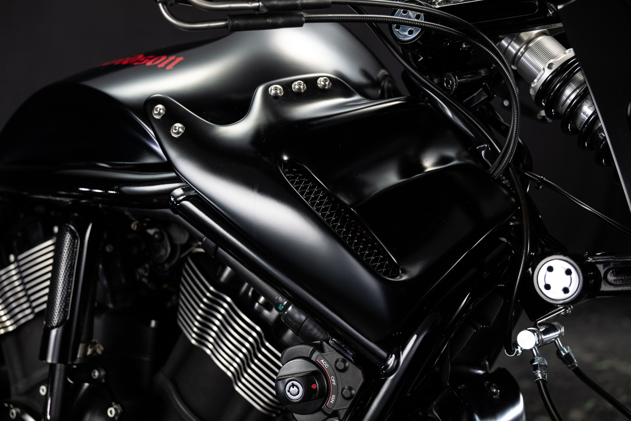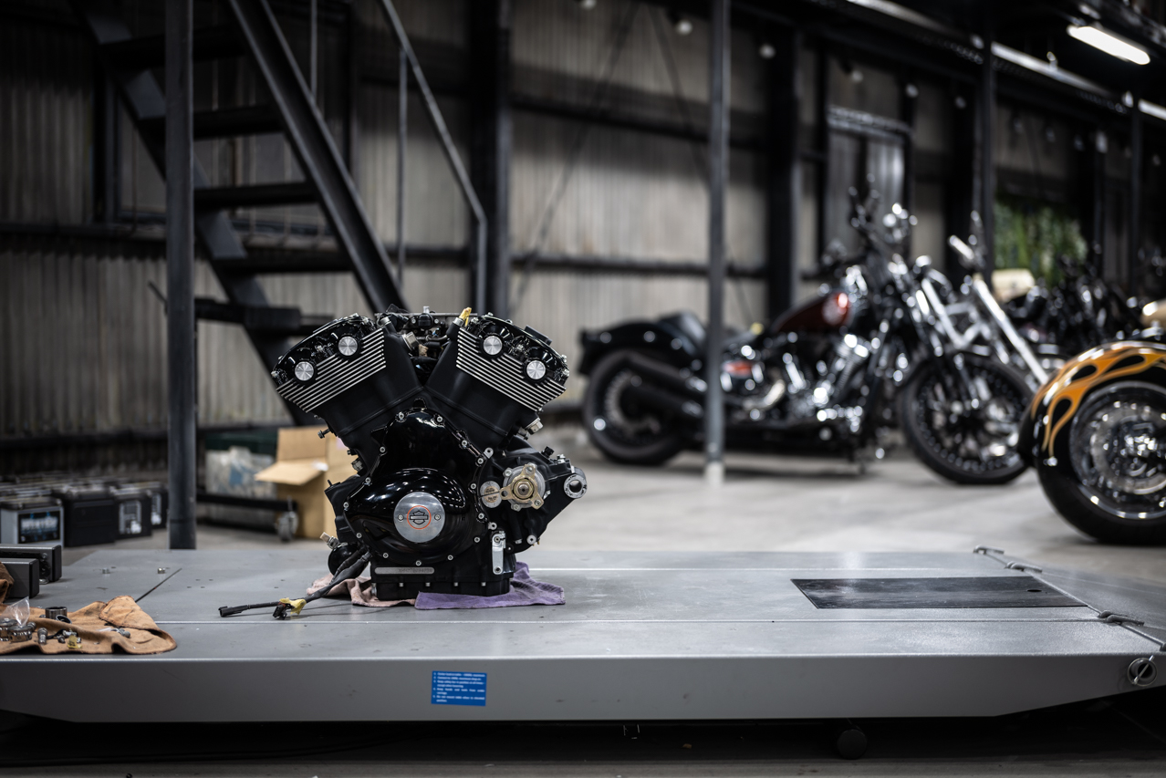 弊社製作のV-RODカスタムにおいて、現状その頂点を極める仕様の車両です。アメリカ : Renegade Custom Motorcycle Wheels社に製作を依頼しております、弊社オリジナルデザインによる1ピース・アルミビレット製ホィールを装着。フロントホィールのサイズは大口径23インチとなります。またスィングアームを純正の長さより50mm延長をしており文字通りのロー&ロングのスタイリングを実現。因みに歴代ハーレーの各モデルの中でV-RODに使用されている純正リアベルトが一番長い設定となっている為、必然的に同車のリア駆動はチェーン仕様に変更を致しております。またリア駆動をチェーンに変更する為、トランスミッションスプロケット及びリアチェーンスプロケットはV-RODの純正歯数より算出しオリジナルにて製作をしたスプロケットを使用しております。その他オリジナルのワンメイク・ガーターフォークの装着、純正フレームへの大幅なモディファイ、ガソリンタンクのワンメイク、またハンドルも然り等々、ご覧の通りの一切妥協の無い完璧な仕上がりのV-RODカスタムとなっております。走行距離も極めて少なく、また常時室内保管の車両ですので外観の美観も損なわれておりません。現車は只今弊社ファクトリーにてご覧頂けます。