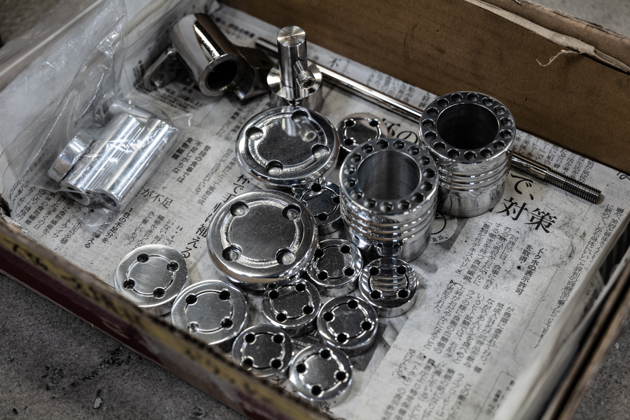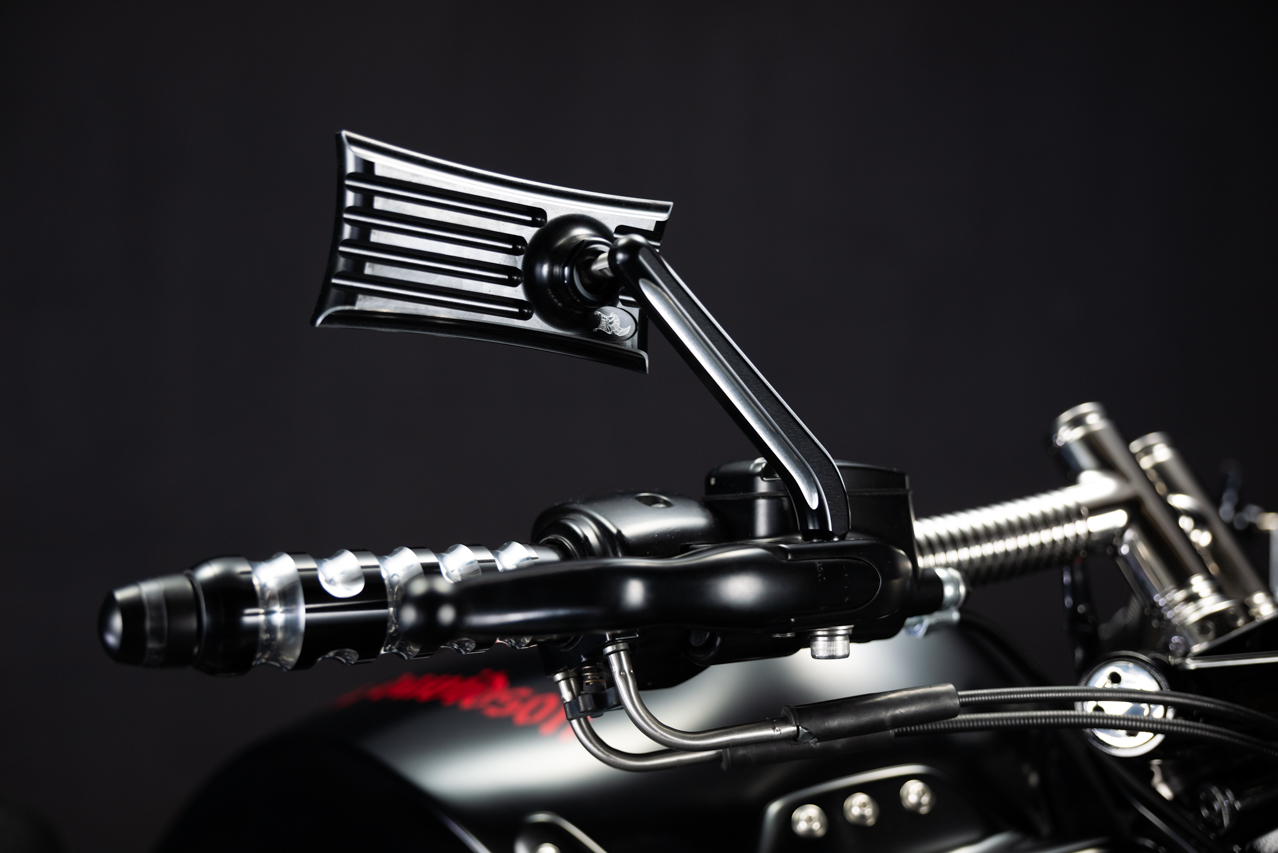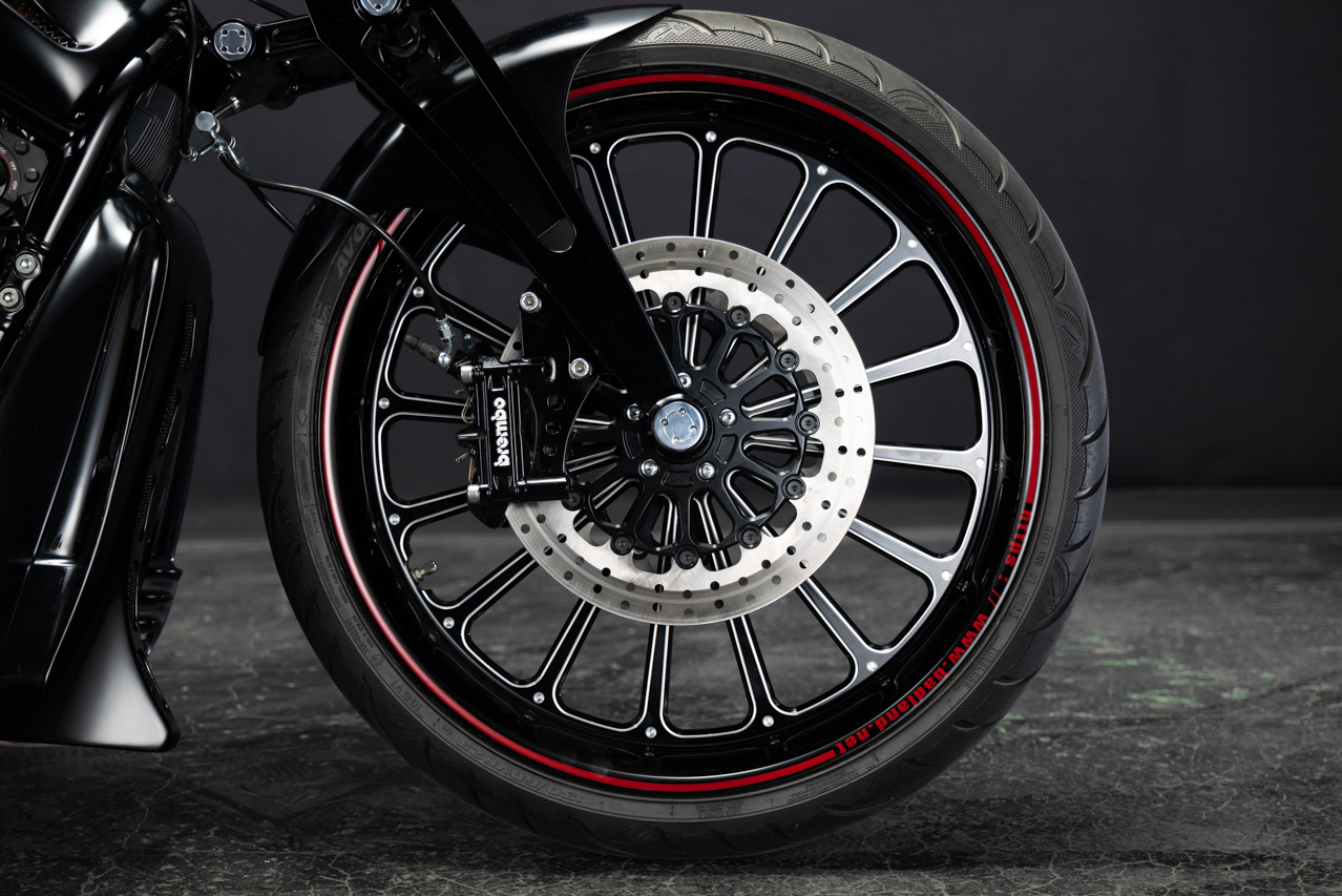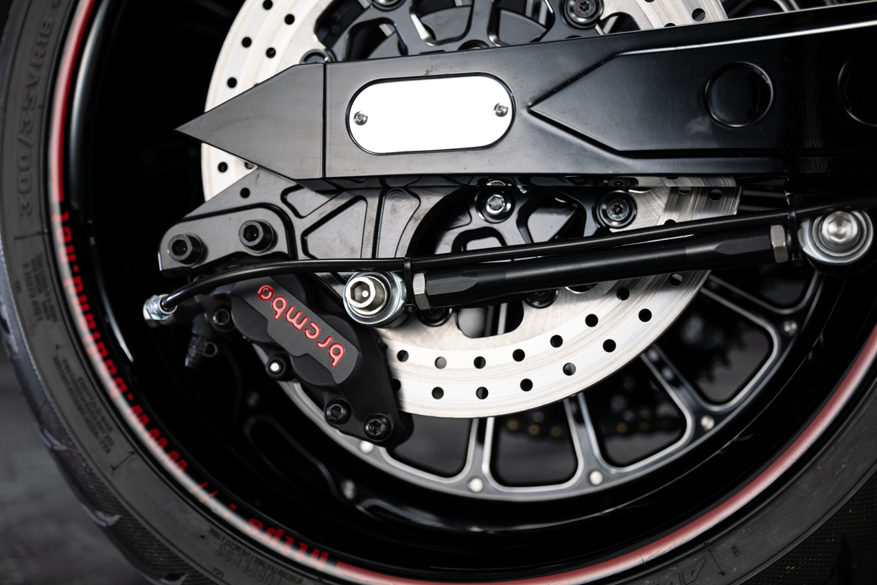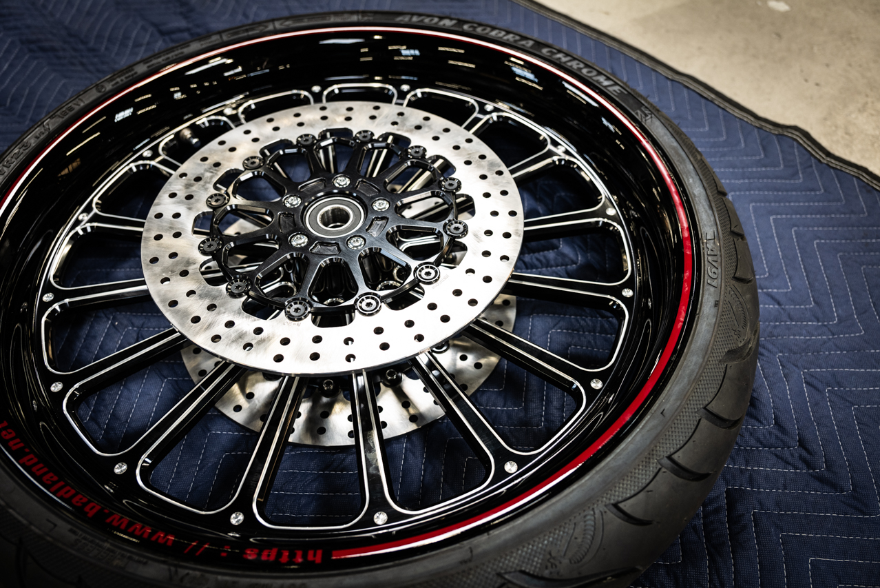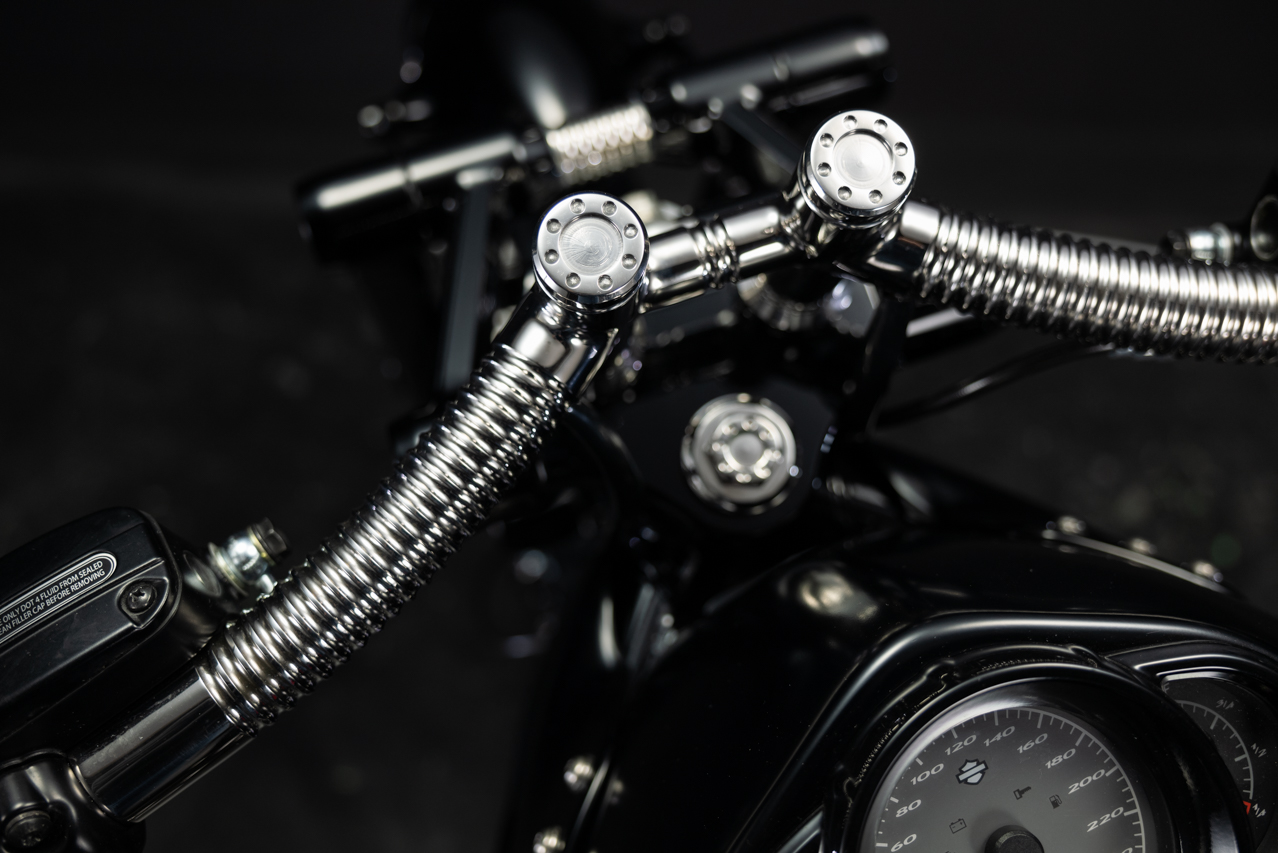 弊社製作のV-RODカスタムにおいて、現状その頂点を極める仕様の車両です。アメリカ : Renegade Custom Motorcycle Wheels社に製作を依頼しております、弊社オリジナルデザインによる1ピース・アルミビレット製ホィールを装着。フロントホィールのサイズは大口径23インチとなります。またスィングアームを純正の長さより50mm延長をしており文字通りのロー&ロングのスタイリングを実現。因みに歴代ハーレーの各モデルの中でV-RODに使用されている純正リアベルトが一番長い設定となっている為、必然的に同車のリア駆動はチェーン仕様に変更を致しております。またリア駆動をチェーンに変更する為、トランスミッションスプロケット及びリアチェーンスプロケットはV-RODの純正歯数より算出しオリジナルにて製作をしたスプロケットを使用しております。その他オリジナルのワンメイク・ガーターフォークの装着、純正フレームへの大幅なモディファイ、ガソリンタンクのワンメイク、またハンドルも然り等々、ご覧の通りの一切妥協の無い完璧な仕上がりのV-RODカスタムとなっております。走行距離も極めて少なく、また常時室内保管の車両ですので外観の美観も損なわれておりません。現車は只今弊社ファクトリーにてご覧頂けます。